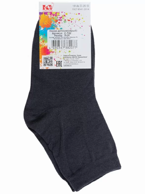 Круглогодичные укороченные детские носки, цвет темно-серый, классические, возможно бесшовные, принт (рисунок): однотонный, без рисунков/узоров, состав: 74% хлопок, 20% полиамид, 6% эластан, арт. С-742. Производитель «КРАСНАЯ ВЕТКА» Россия под брендом «Красная ветка».
