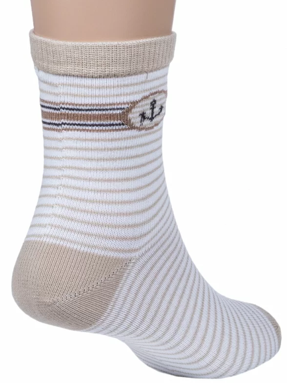 Симпатичные повседневные носочки для детей в бело-бежевых тонах. Мягкие, удобные, эластичные - состоят на 90% из хлопка. А входящий в состав эластан и полиамид делают изделие более плотным, износостойким, но при этом хорошо тянущимся. Резиночка не пережимает нежную детскую кожу. Особенность модели - полосатый узор и изображение якоря.