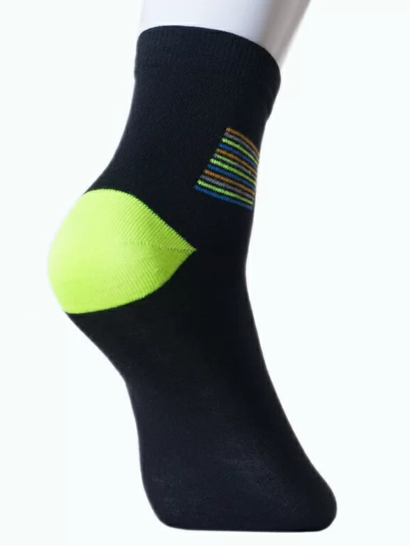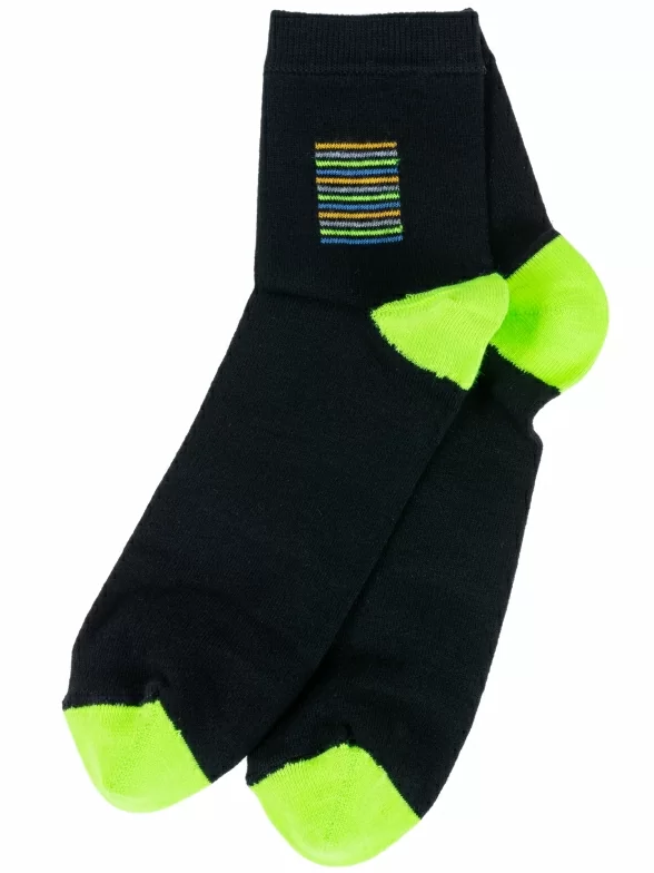 Носки LORENZline для детей. Подарят комфорт и мягкость в течение всего дня, благодаря высокому содержанию хлопка в составе - 90%. Изделие классической длины, черного цвета. Мысок и пятка контрастного яркого салатового цвета. Так же модель украшена небольшим рисунком в виде разноцветных полосочек.