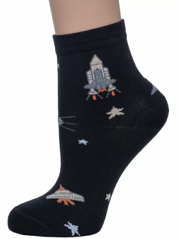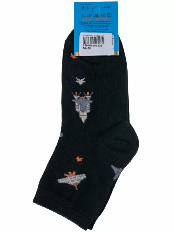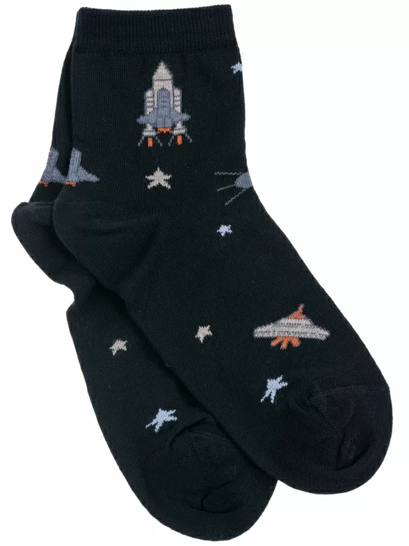 Симпатичные повседневные носочки для детей. Мягкие, удобные, эластичные - состоят на 85% из хлопка. А входящий в состав эластан и полиамид делают изделие более плотным, износостойким, но при этом хорошо тянущимся. Резиночка не пережимает нежную детскую кожу. Особенность модели - космический рисунок.