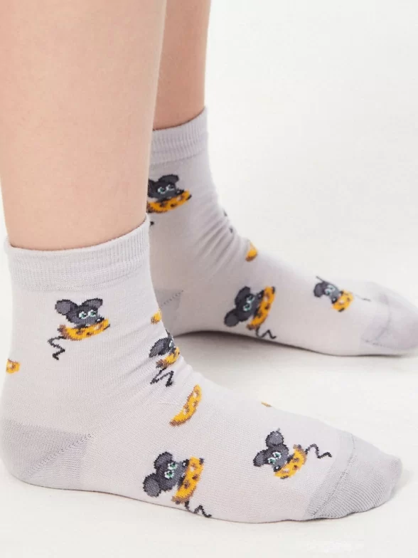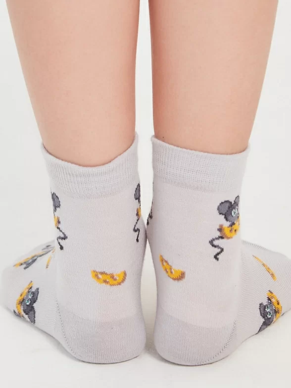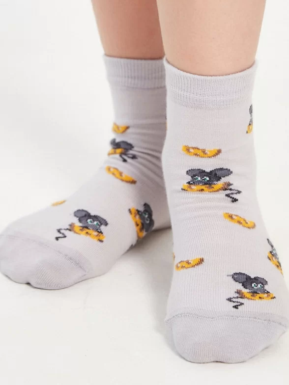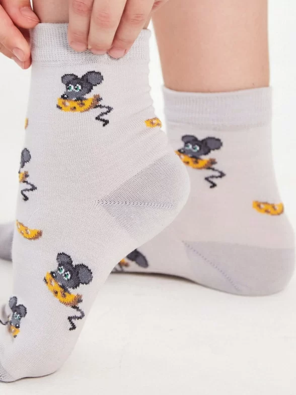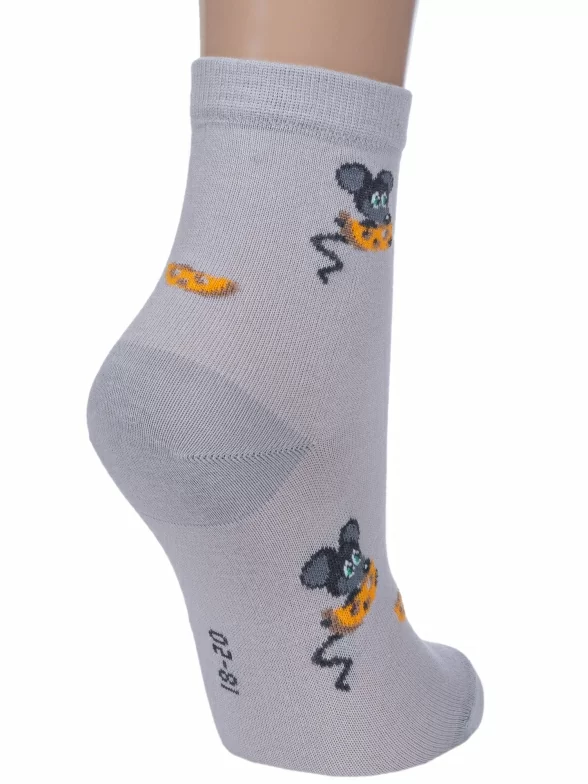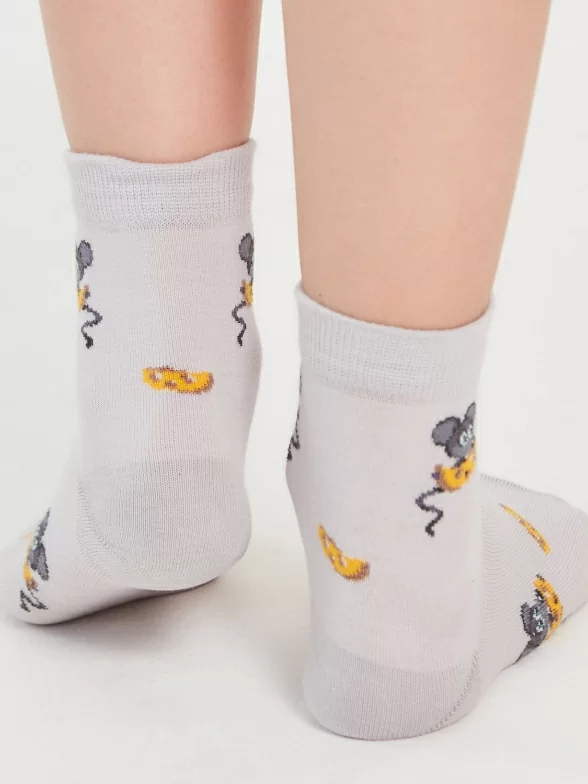 Хлопковые детские носки серого цвета. Связаны в России, известным брендом LORENZLine. Мягкие, удобные, эластичные - состоят на 90% из хлопка. А входящий в состав эластан и полиамид делают изделие более плотным, износостойким, но при этом хорошо тянущимся. Детишки оценят прикольные рисуночки в виде мышонка, поедающего сыр.