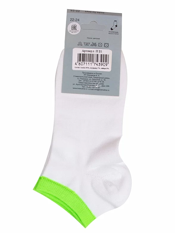 Межсезонные или летние короткие детские носки, цвет белый, классические, состав: 90% хлопок, 7% полиамид, 3% эластан (лайкра), фабричный артикул П21. Производитель «ИП Мурзаков В.А., Ставропольский край, Россия» под брендом «Lorenzline».