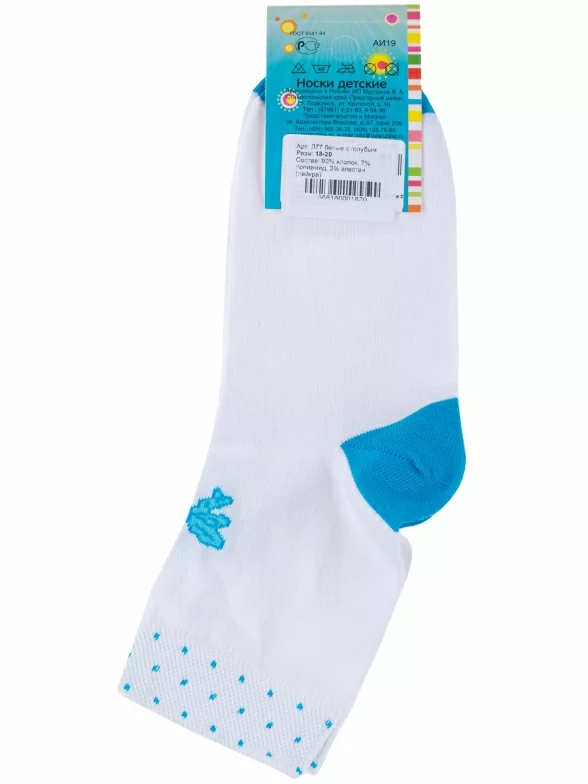 Круглогодичные укороченные детские носки, цвет голубой-белый, повседневные, шов обычный (не бесшовные), принт (рисунок): контрастные пятка / мысок / резинка, бабочки / бантики, с узором, небольшой рисунок, состав: 90% хлопок, 7% полиамид, 3% эластан (лайкра), арт. Л77. Производитель «ИП Мурзаков В.А., Ставропольский край, Россия» под брендом «Lorenzline».