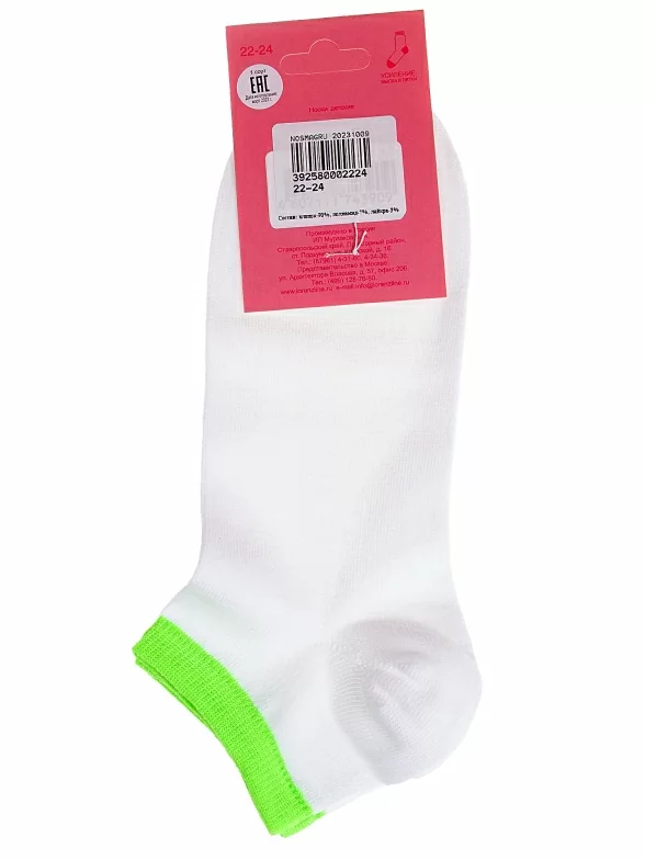Межсезонные или летние короткие детские носки, цвет белый, классические, состав: 90% хлопок, 7% полиамид, 3% эластан (лайкра), фабричный артикул П21. Производитель «ИП Мурзаков В.А., Ставропольский край, Россия» под брендом «Lorenzline».