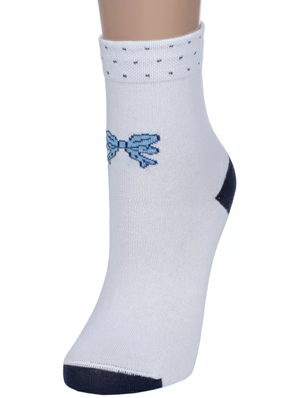 Круглогодичные укороченные детские носки, цвет голубой-белый, повседневные, шов обычный (не бесшовные), принт (рисунок): контрастные пятка / мысок / резинка, бабочки / бантики, с узором, небольшой рисунок, состав: 90% хлопок, 7% полиамид, 3% эластан (лайкра), арт. Л77. Производитель «ИП Мурзаков В.А., Ставропольский край, Россия» под брендом «Lorenzline».