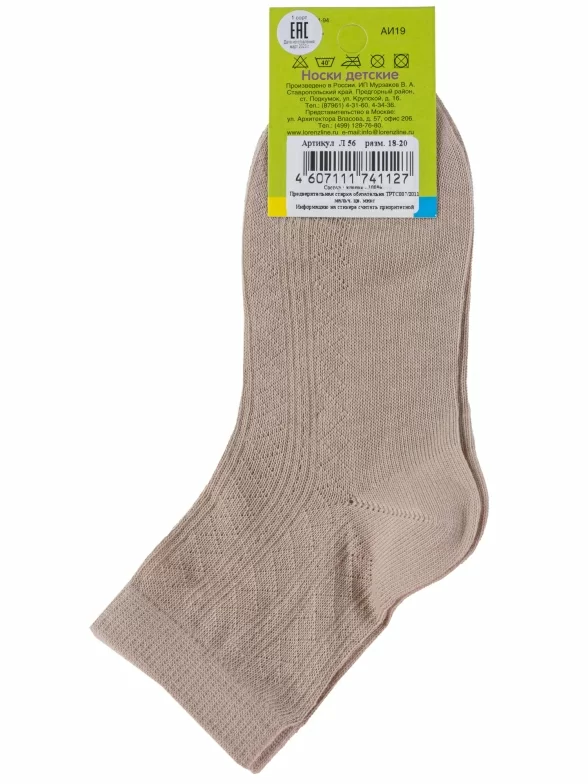 Летние средней длины детские носки, цвет бежевый, в сеточку, классические, шов обычный (не бесшовные), принт (рисунок): в рубчик, однотонный, состав: 100% хлопок, арт. Л56М. Производитель «ИП Мурзаков В.А., Ставропольский край, Россия» под брендом «Lorenzline».