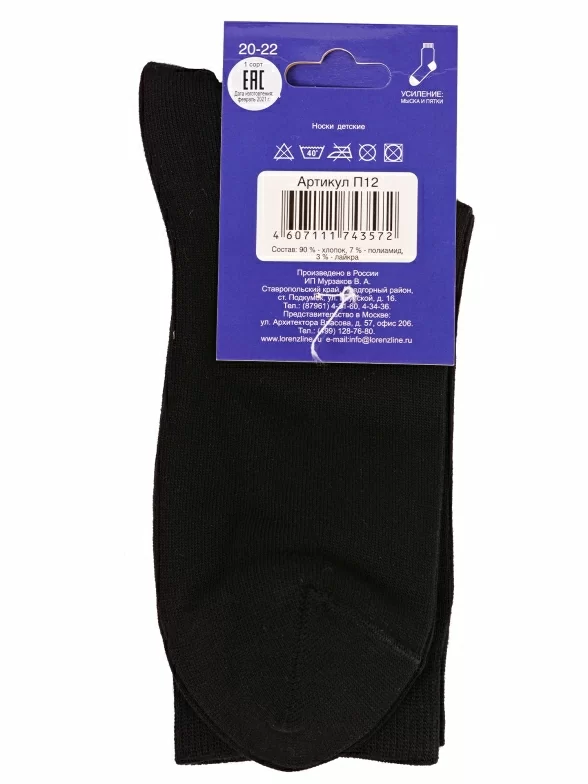 Круглогодичные средней длины детские носки, цвет черный, классические, возможно бесшовные, принт (рисунок): однотонный, без рисунков/узоров, состав: 90% хлопок, 7% полиамид, 3% эластан (лайкра), арт. П12. Производитель «ИП Мурзаков В.А., Ставропольский край, Россия» под брендом «Lorenzline».