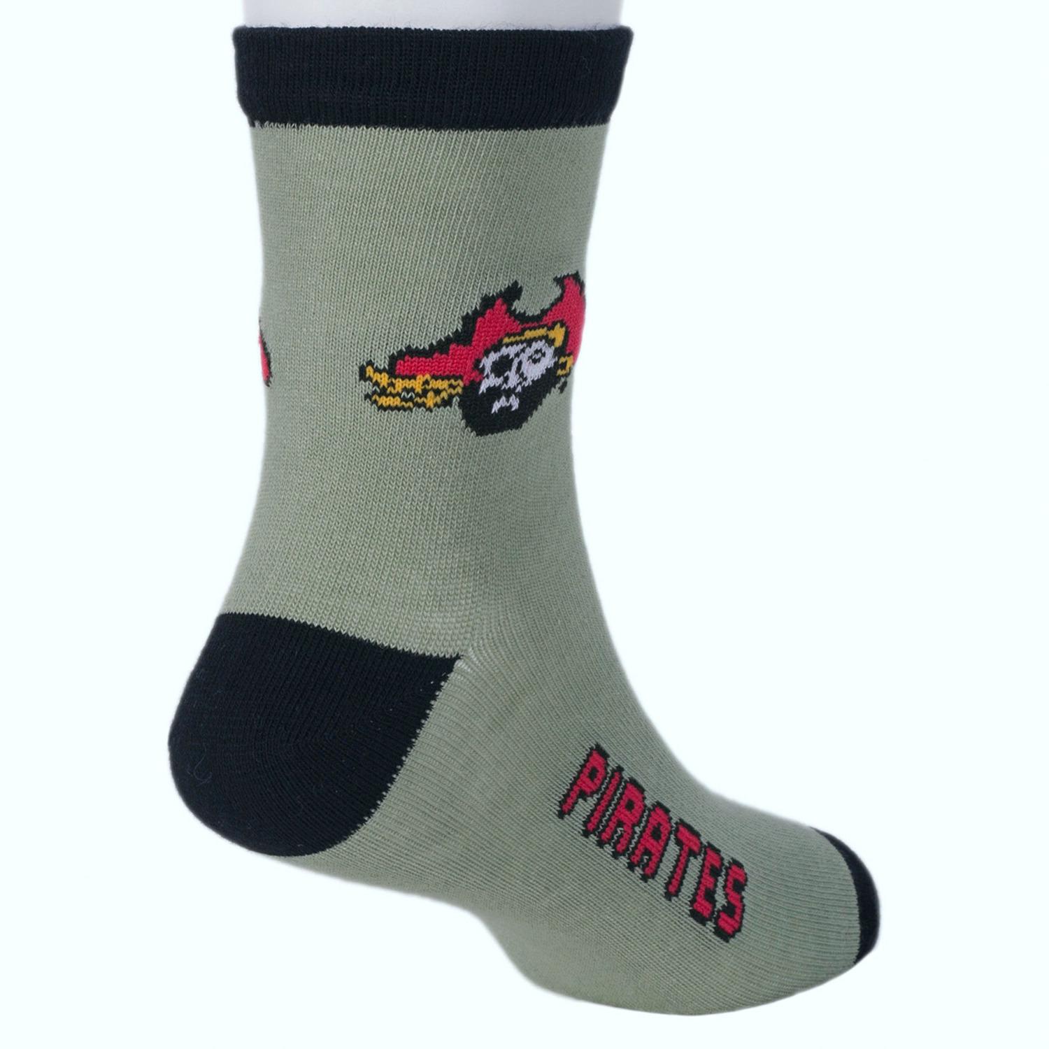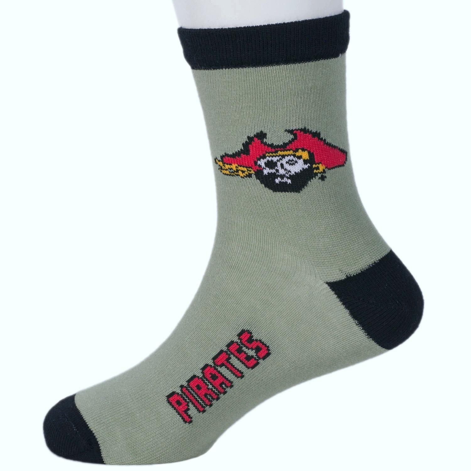 Красивые носки для детей цвета хаки с надписью "Pirates". Производитель LORENZLine. Изготовлены в России на современном оборудовании, с использованием высококачественного хлопкового сырья. Модель с забавным пиратским принтом. После стирок не скатываются и не теряют яркость цвета.