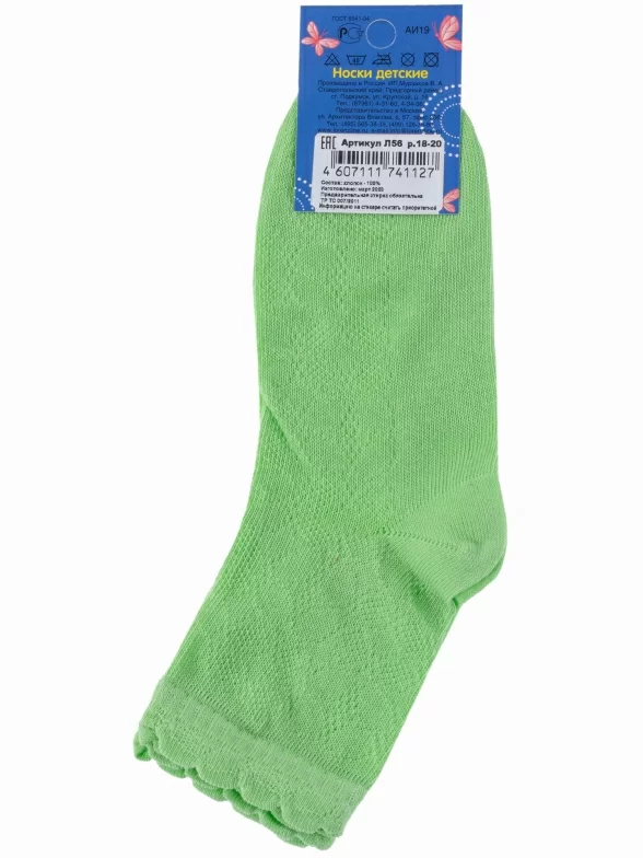 Летние средней длины детские носки, цвет салатовый, в сеточку, классические, шов обычный (не бесшовные), принт (рисунок): однотонный, состав: 100% хлопок, арт. Л56Д. Производитель «ИП Мурзаков В.А., Ставропольский край, Россия» под брендом «Lorenzline».