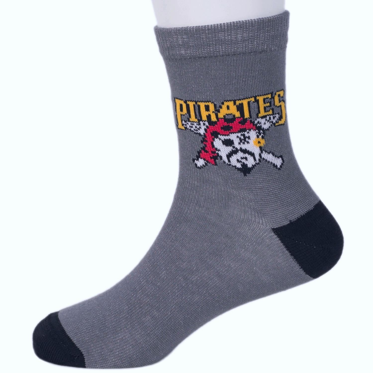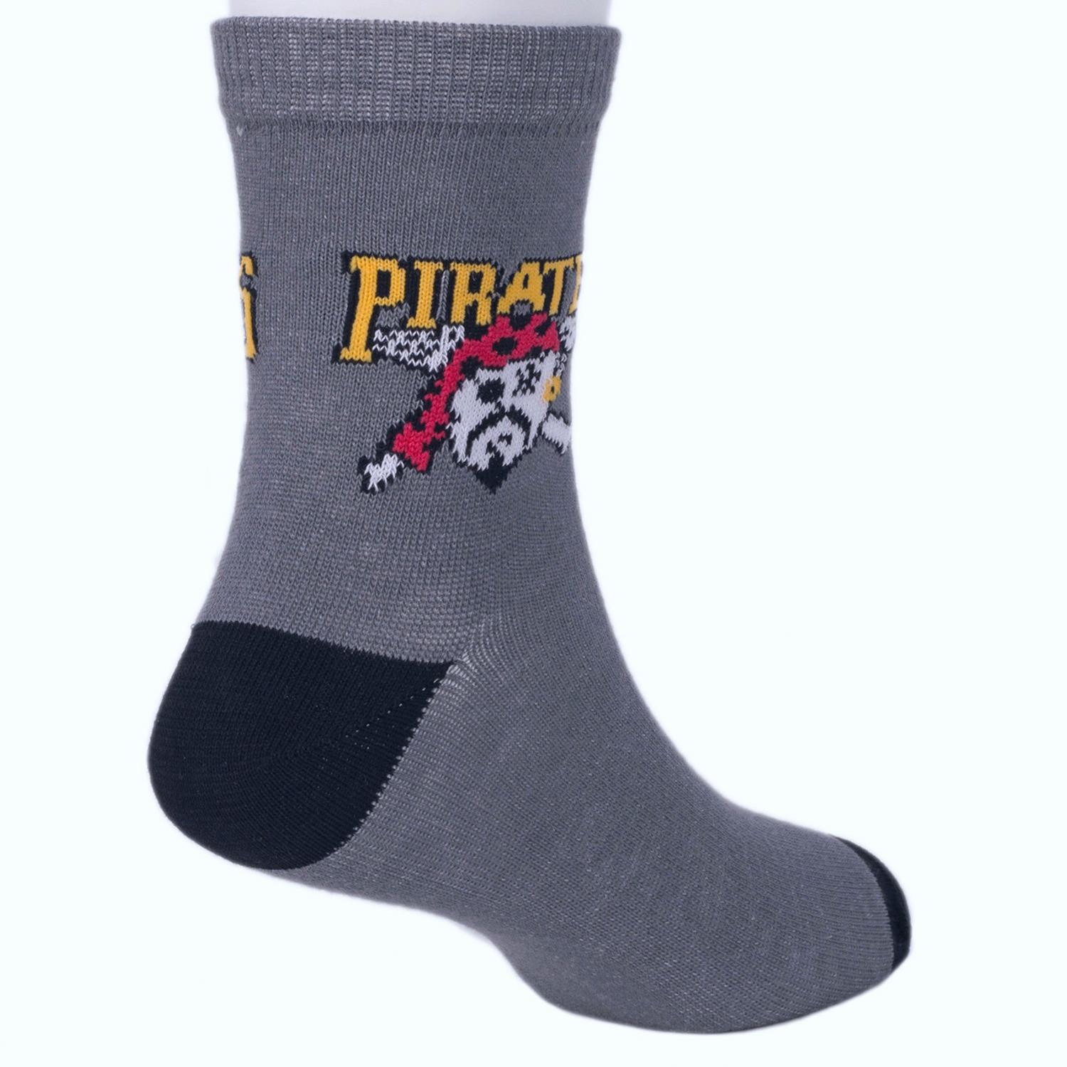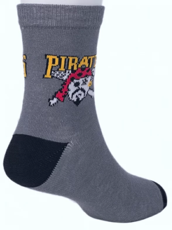 Красивые носки для детей серого цвета с надписью "Pirates" и забавным пиратским принтом. Производитель LORENZLine. Изготовлены в России на современном оборудовании, с использованием высококачественного хлопкового сырья.
