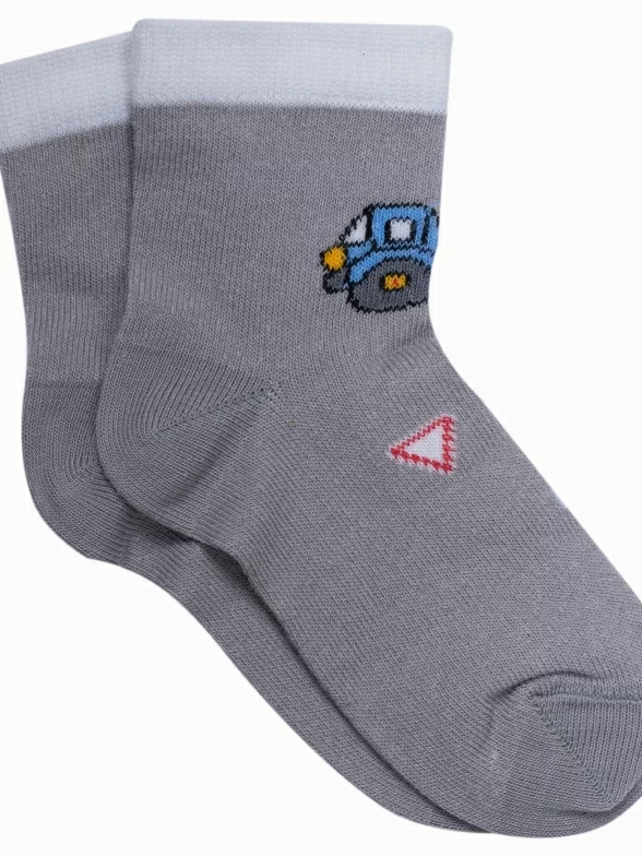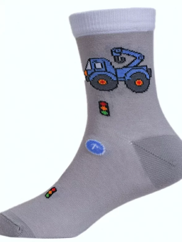 Красивые носки для детей серого цвета. Производитель LORENZLine. Изготовлены в России на современном оборудовании, с использованием высококачественного хлопкового сырья. Состоят на 90% из хлопка. После многочисленных стирок не теряют форму, не покрываются катышками. Эластичная резинка не перетягивает ногу. Принт - дорожная техника, который понравится каждому мальчишке.