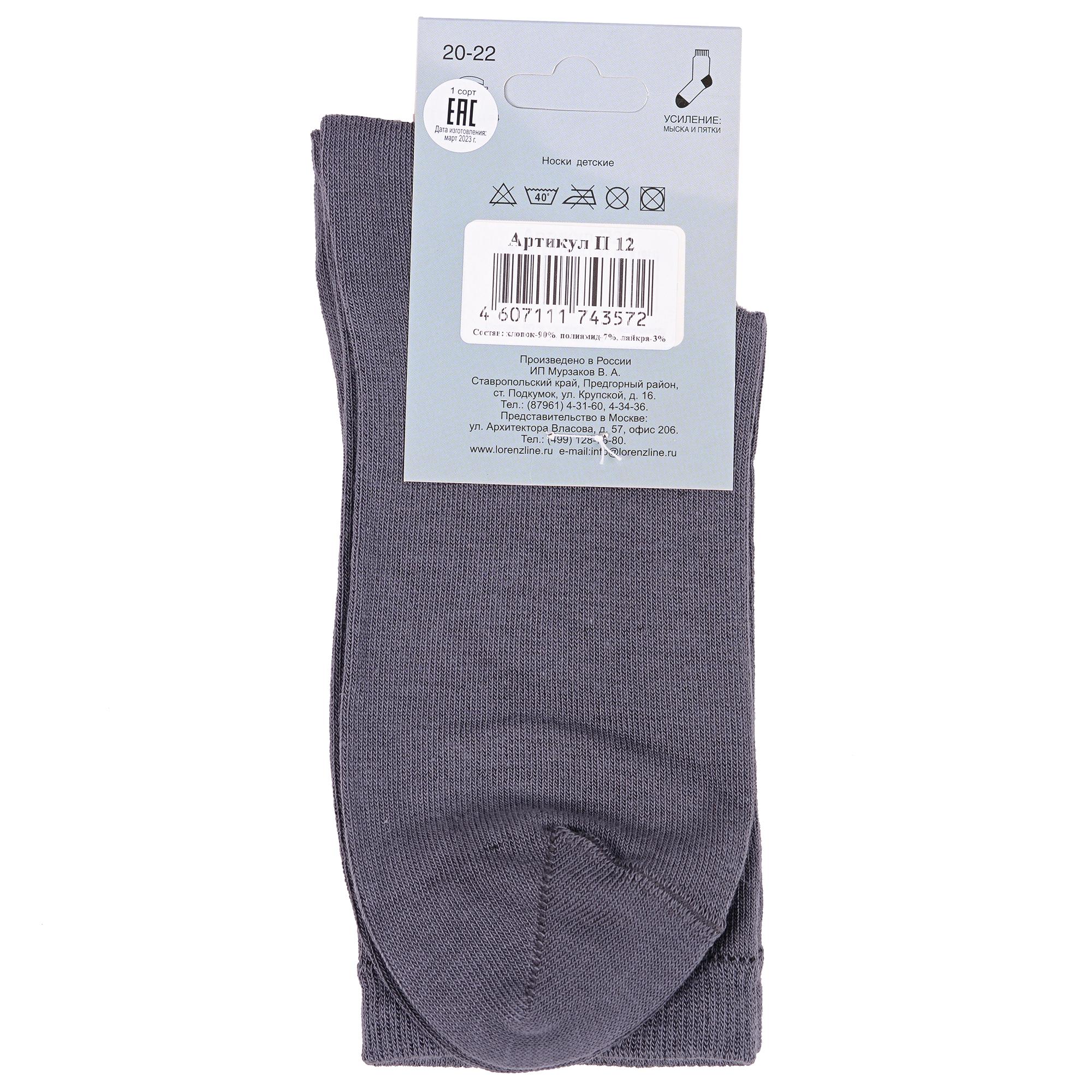Круглогодичные средней длины детские носки, цвет серый, классические, возможно бесшовные, принт (рисунок): однотонный, без рисунков/узоров, состав: 90% хлопок, 7% полиамид, 3% эластан (лайкра), арт. П12. Производитель «ИП Мурзаков В.А., Ставропольский край, Россия» под брендом «Lorenzline».