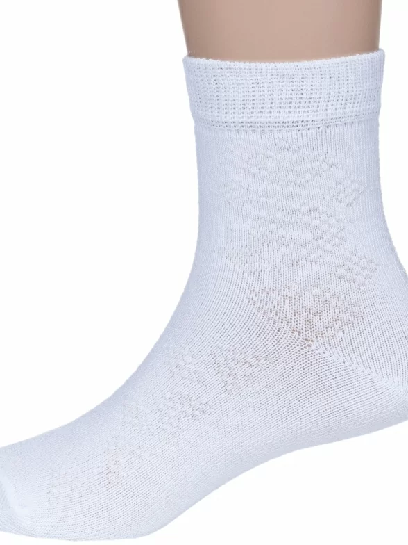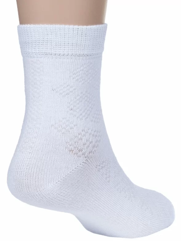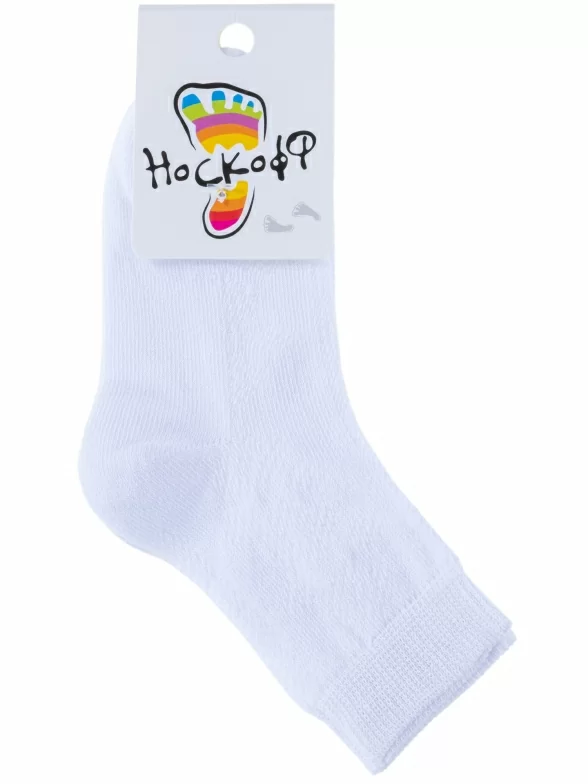 Летние укороченные детские носки, цвет белый, в сеточку, классические, шов обычный (не бесшовные), принт (рисунок): геометрия, с узором, однотонный, состав: 67% хлопок, 30% полиамид, 3% полиуретан (эластан), арт. АС151. Производитель «Носкофф» Россия под брендом «Носкофф (алсу)».