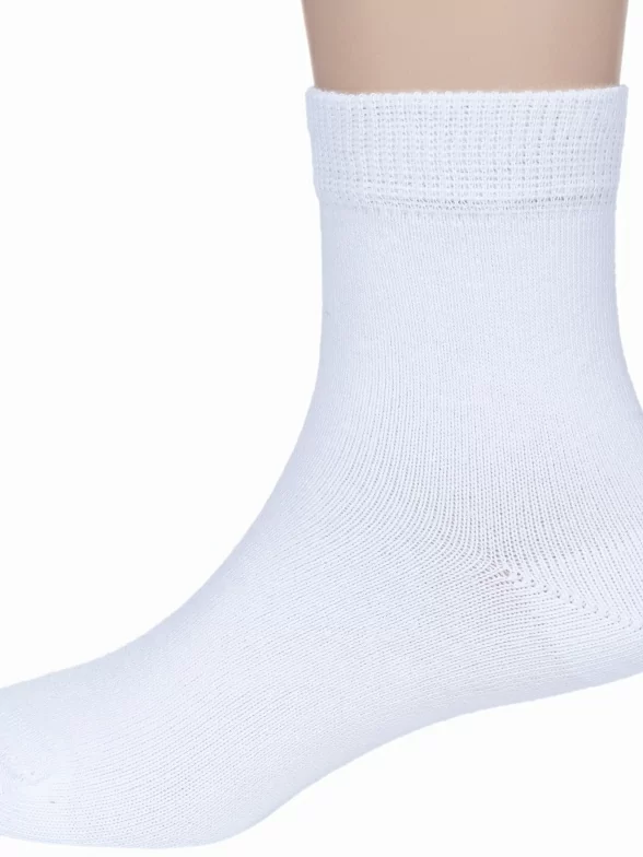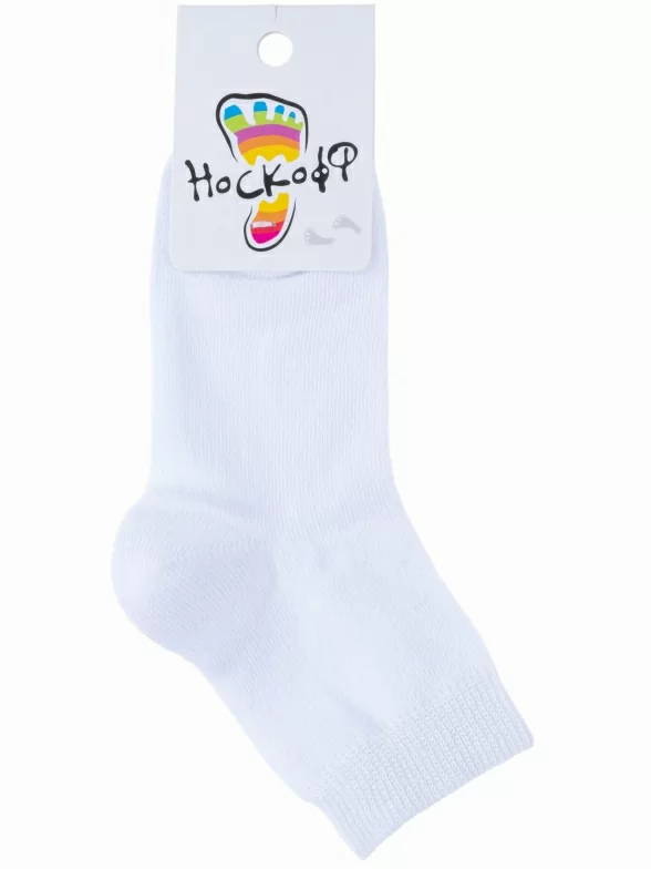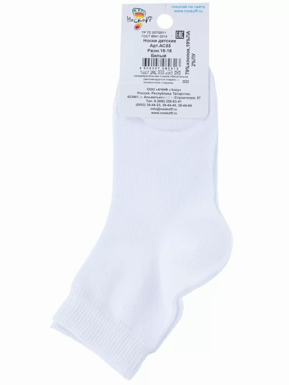 Круглогодичные укороченные детские носки, цвет белый, классические, шов обычный (не бесшовные), принт (рисунок): однотонный, без рисунков/узоров, состав: 79% хлопок, 19% полиамид, 2% полиуретан (эластан), арт. АС55. Производитель «Носкофф» Россия под брендом «Носкофф (алсу)».