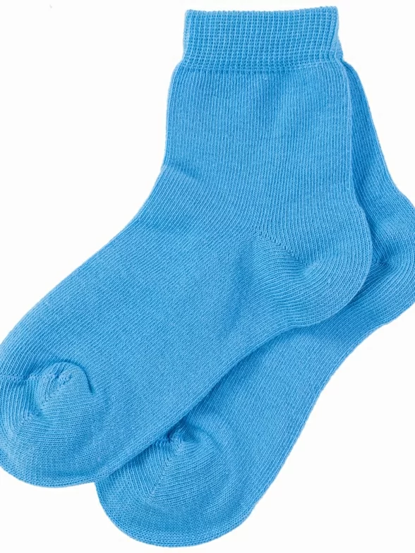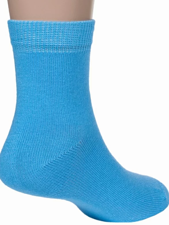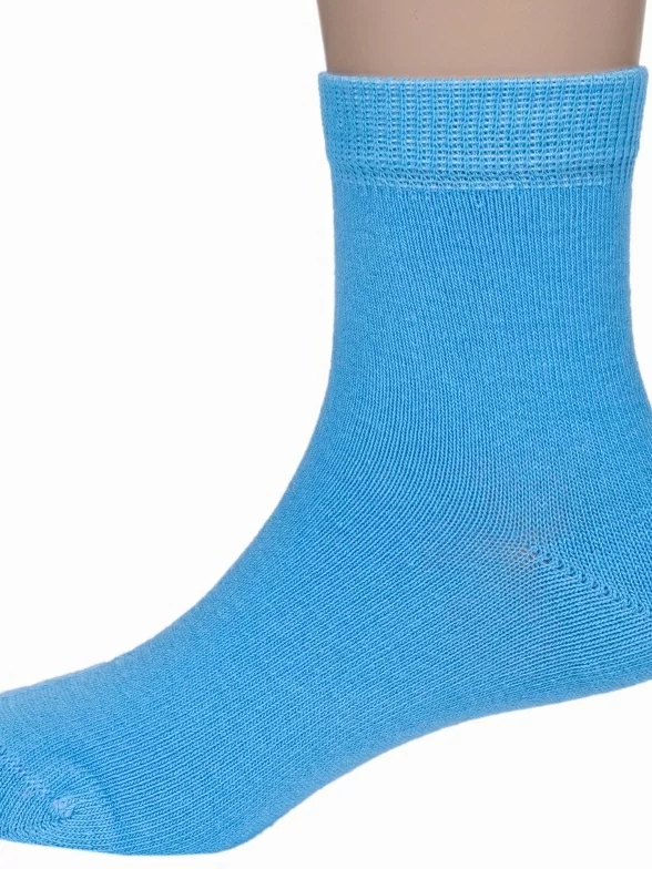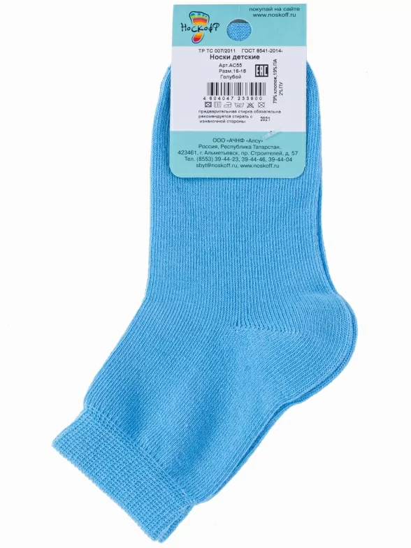 Круглогодичные укороченные детские носки, цвет голубой, классические, шов обычный (не бесшовные), принт (рисунок): однотонный, без рисунков/узоров, состав: 79% хлопок, 19% полиамид, 2% полиуретан (эластан), арт. АС55. Производитель «Носкофф» Россия под брендом «Носкофф (алсу)».