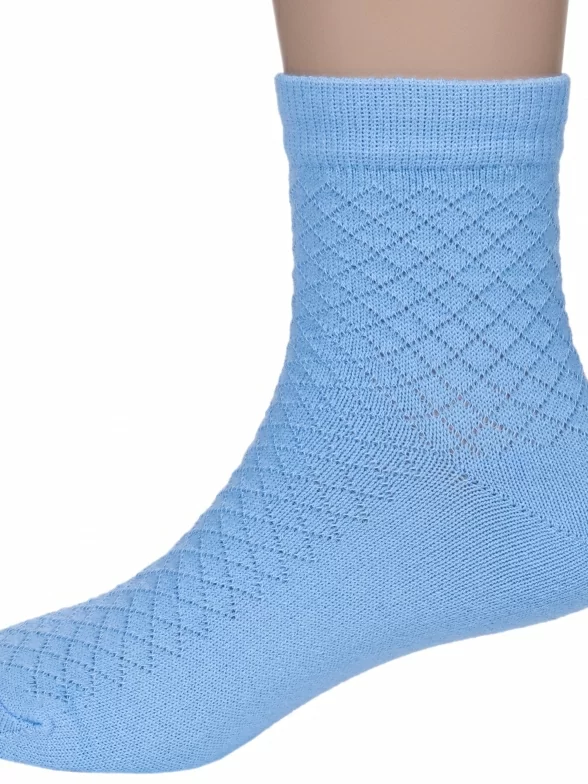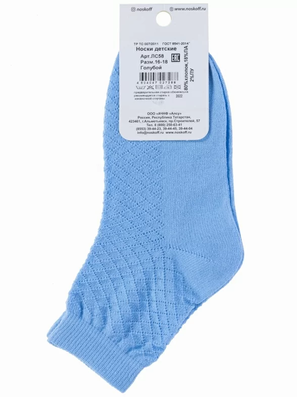 Летние укороченные детские носки, цвет голубой, в сеточку, классические, шов обычный (не бесшовные), принт (рисунок): геометрия, с узором, однотонный, состав: 80% хлопок, 18% полиамид, 2% полиуретан (эластан), арт. ЛС58. Производитель «Носкофф» Россия под брендом «Носкофф (алсу)».