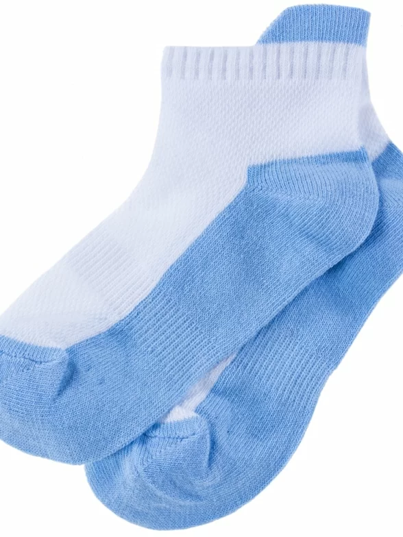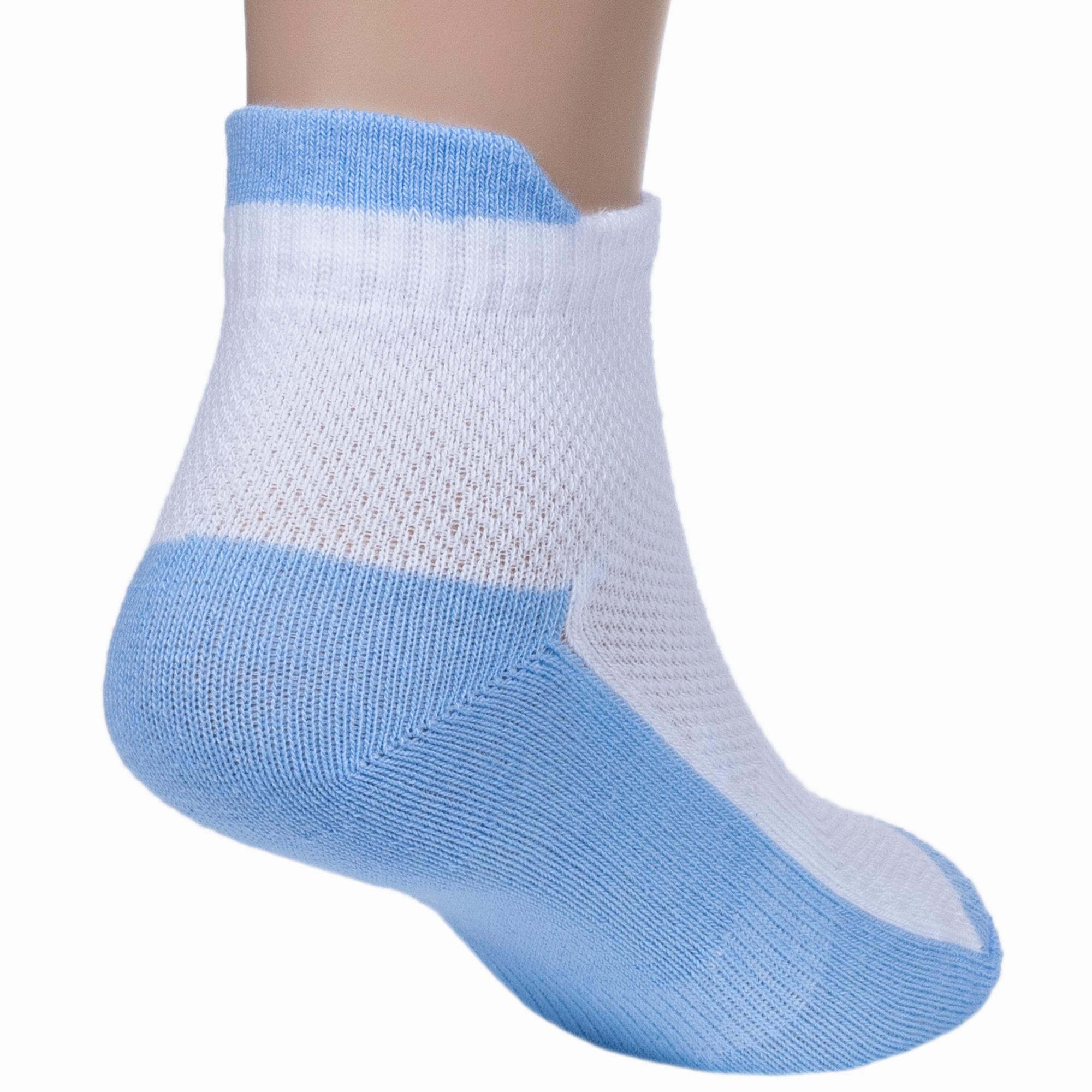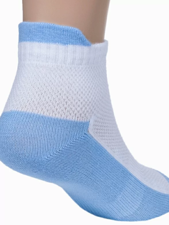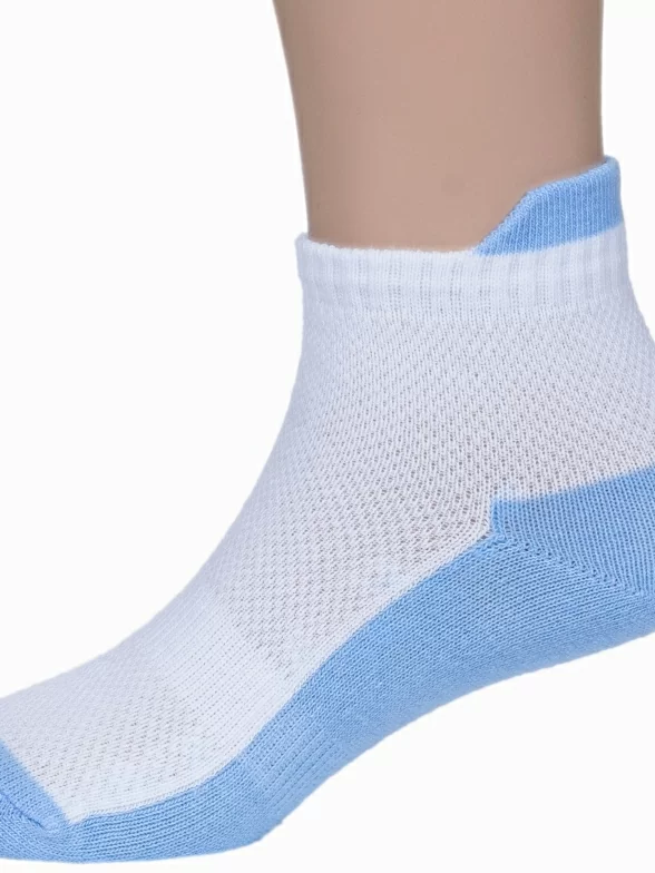 Летние короткие детские носки, цвет многоцветные (мультиколор)-белый, в сеточку, спортивные, шов обычный (не бесшовные), принт (рисунок): контрастные пятка / мысок / резинка, с узором, спортивные, состав: 69% хлопок, 24% полиамид, 7% полиуретан (эластан), арт. НД6. Производитель «Носкофф» Россия под брендом «Носкофф (алсу)».