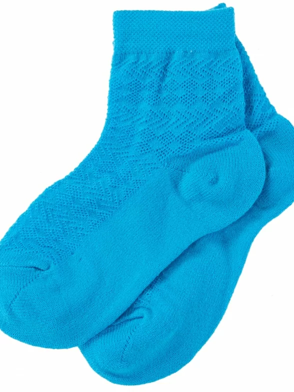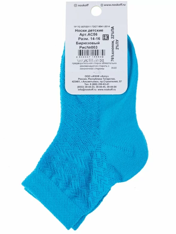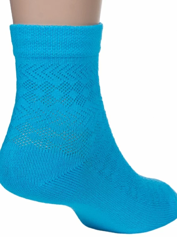 Летние укороченные детские носки, цвет бирюзовый, в сеточку, классические, шов обычный (не бесшовные), принт (рисунок): орнамент, с узором, однотонный, состав: 76% хлопок, 22% полиамид, 2% полиуретан (эластан), арт. АС56. Производитель «Носкофф» Россия под брендом «Носкофф (алсу)».