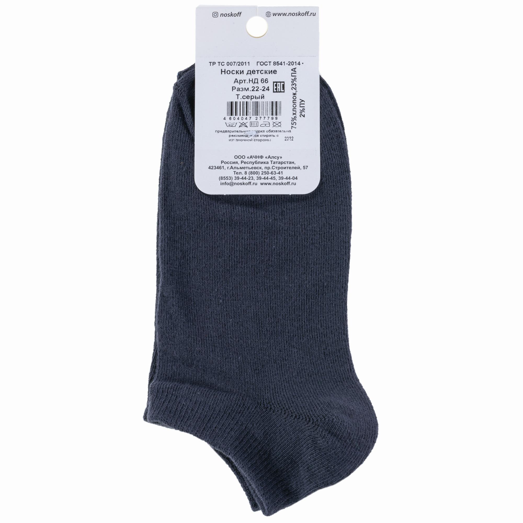 Летние ультракороткие детские носки, цвет темно-серый, классические, шов обычный (не бесшовные), принт (рисунок): однотонный, без рисунков/узоров, состав: 75% хлопок, 23% полиамид, 2% полиуретан (эластан), арт. НД66. Производитель «Носкофф» Россия под брендом «Носкофф (алсу)».