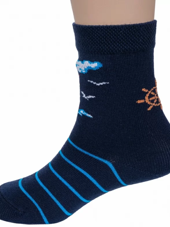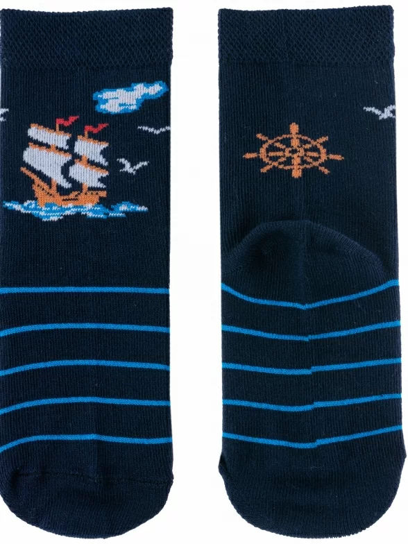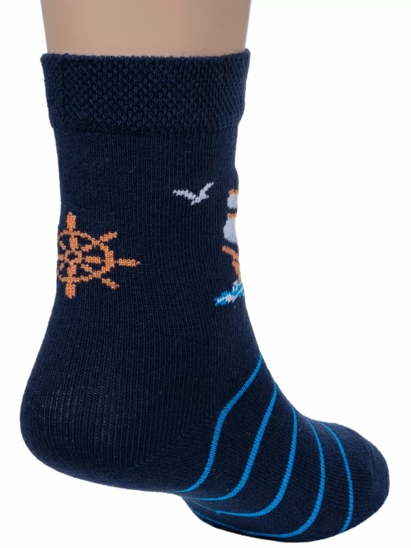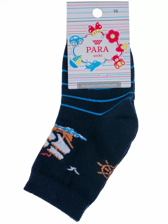 Круглогодичные укороченные детские носки, цвет темно-синий, повседневные, шов обычный (не бесшовные), принт (рисунок): транспорт, море, с узором, состав: 83% хлопок, 15% полиамид, 2% эластан, арт. N1D6. Производитель «ПРОМЭКС ООО, Смоленская область, Россия» под брендом «Para socks».