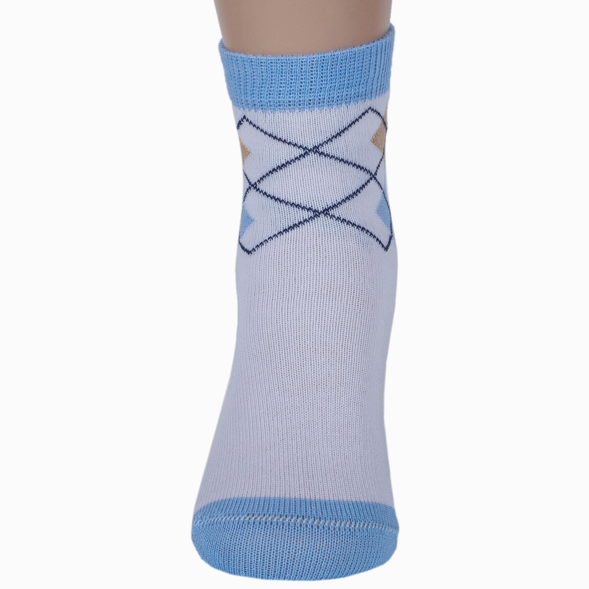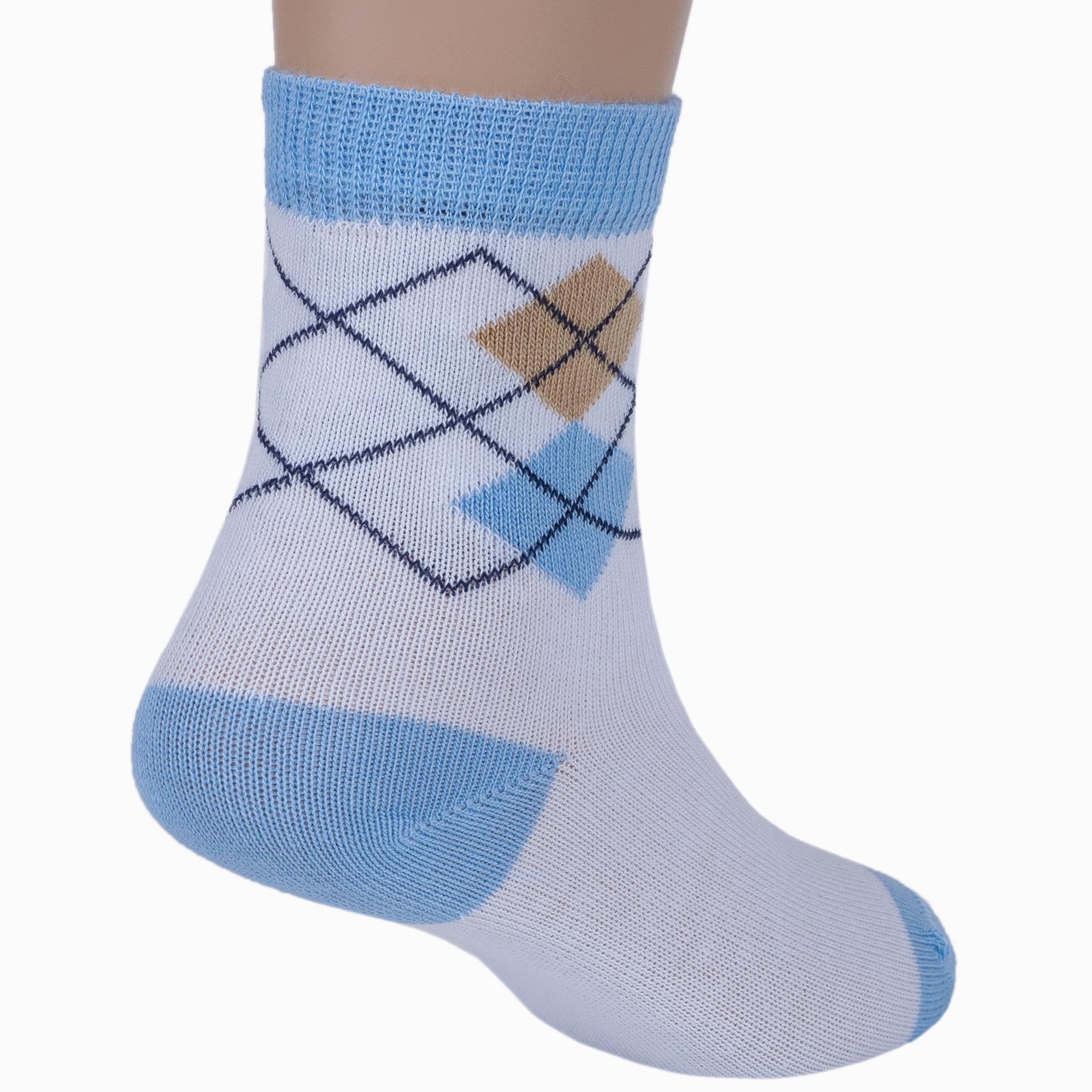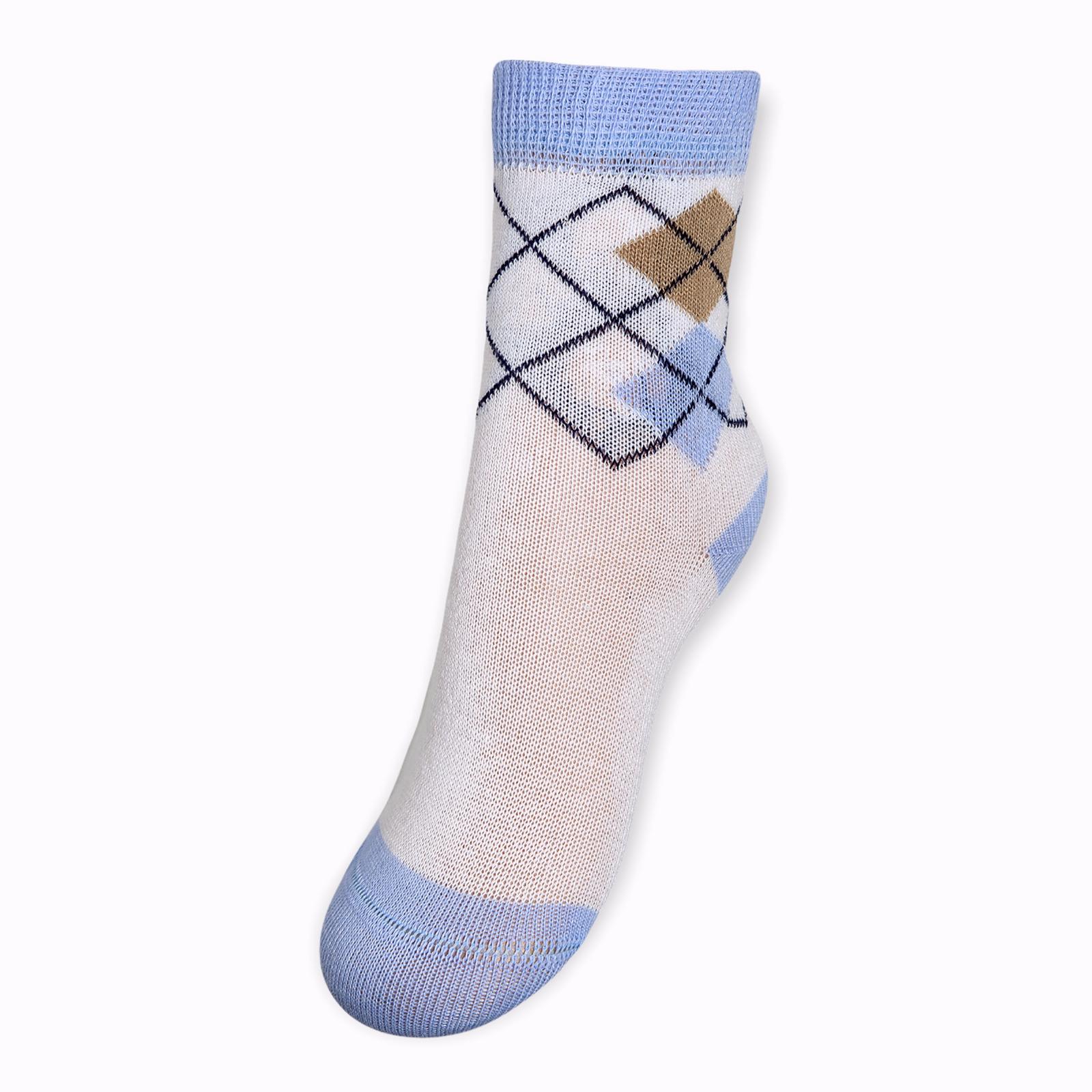 Круглогодичные средней длины детские носки, цвет многоцветные (мультиколор)-белый, повседневные, шов кеттельный (бесшовная технология), принт (рисунок): геометрия, аргайл, с узором, состав: 78% хлопок, 20% полиамид, 2% эластан, арт. Д3-13789. Производитель «ООО Орудьевский трикотаж, Россия» под брендом «Rusocks (орудьевский трикотаж)».