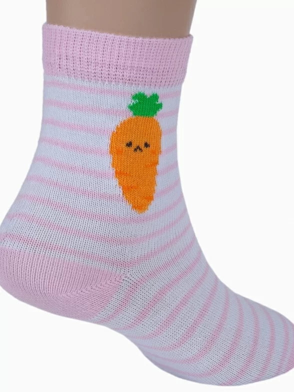 Круглогодичные укороченные детские носки, цвет розовый, повседневные, шов кеттельный (бесшовная технология), принт (рисунок): еда и напитки, с узором, состав: 78% хлопок, 20% полиамид, 2% эластан, арт. Д3-13792Д. Производитель «ООО Орудьевский трикотаж, Россия» под брендом «Rusocks (орудьевский трикотаж)».