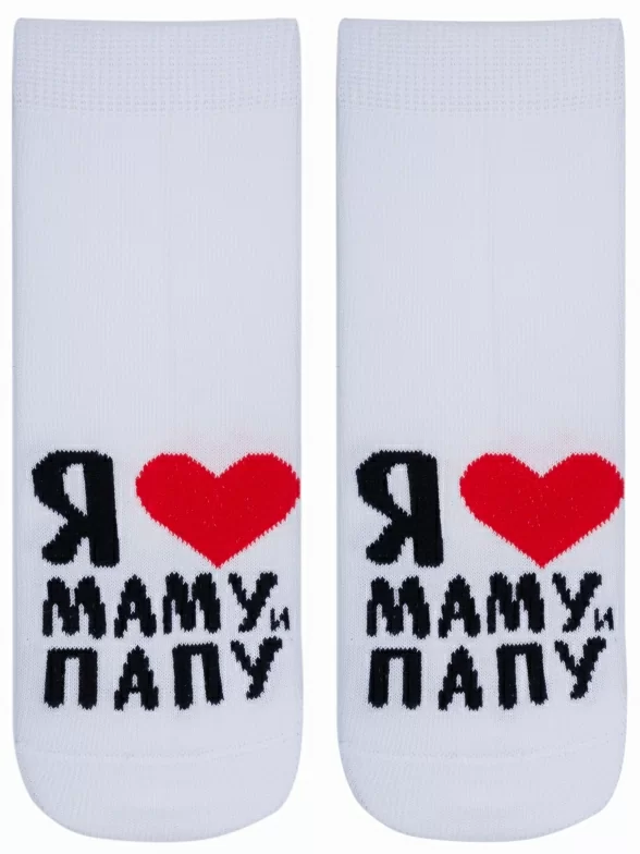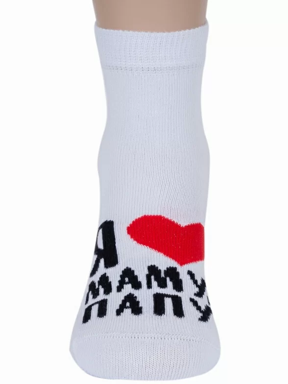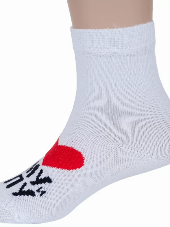 Круглогодичные укороченные детские носки, цвет белый, повседневные, шов кеттельный (бесшовная технология), принт (рисунок): сердечки / поцелуи / любовь, надписи, с узором, крупные контрастные рисунки, состав: 85% хлопок, 13% полиамид, 2% эластан, арт. Д-106/1. Производитель «ООО Орудьевский трикотаж, Россия» под брендом «Rusocks (орудьевский трикотаж)».