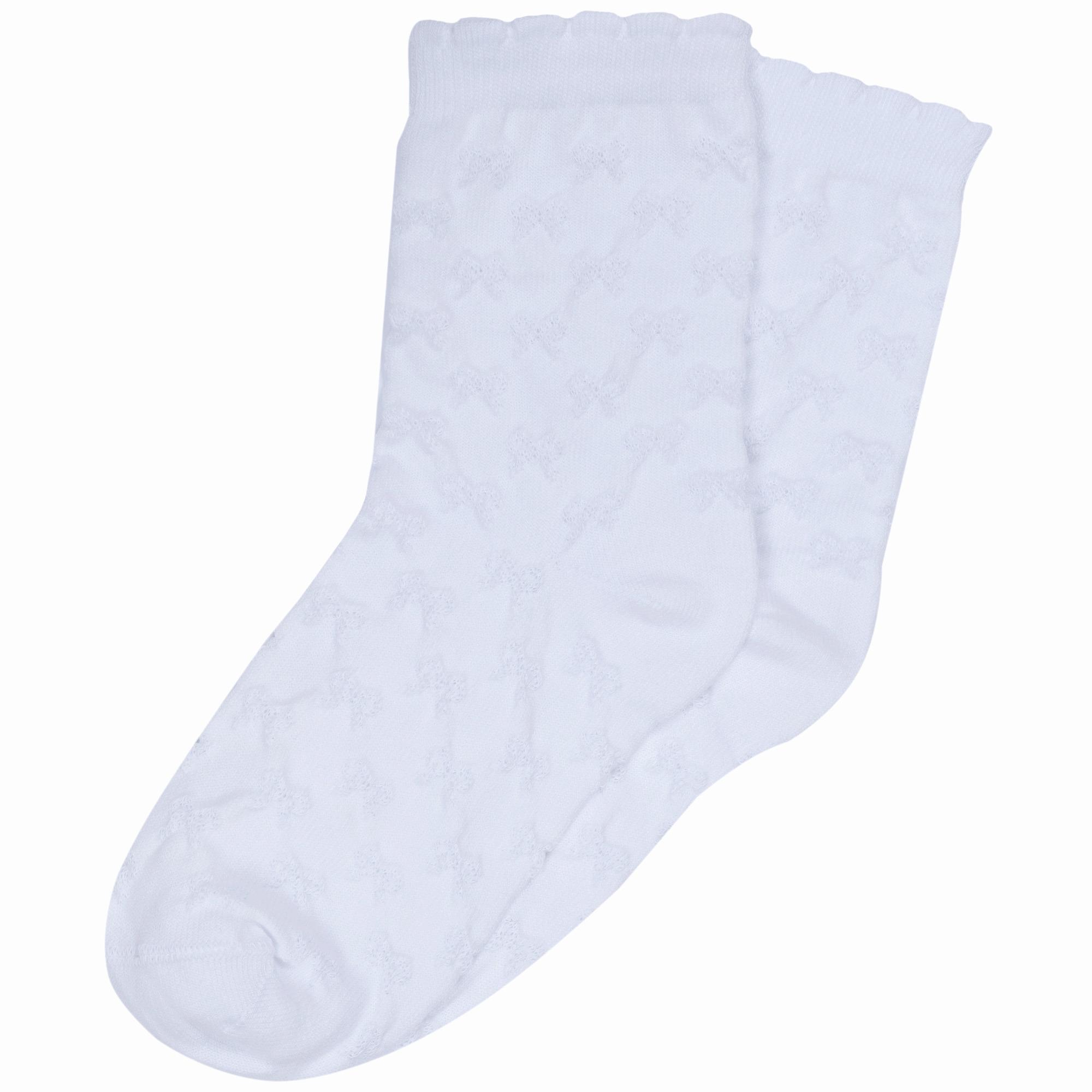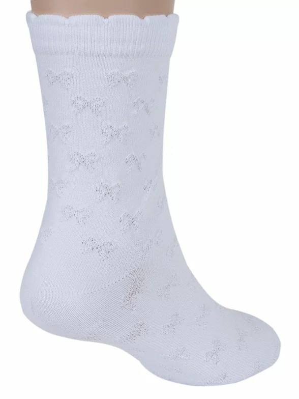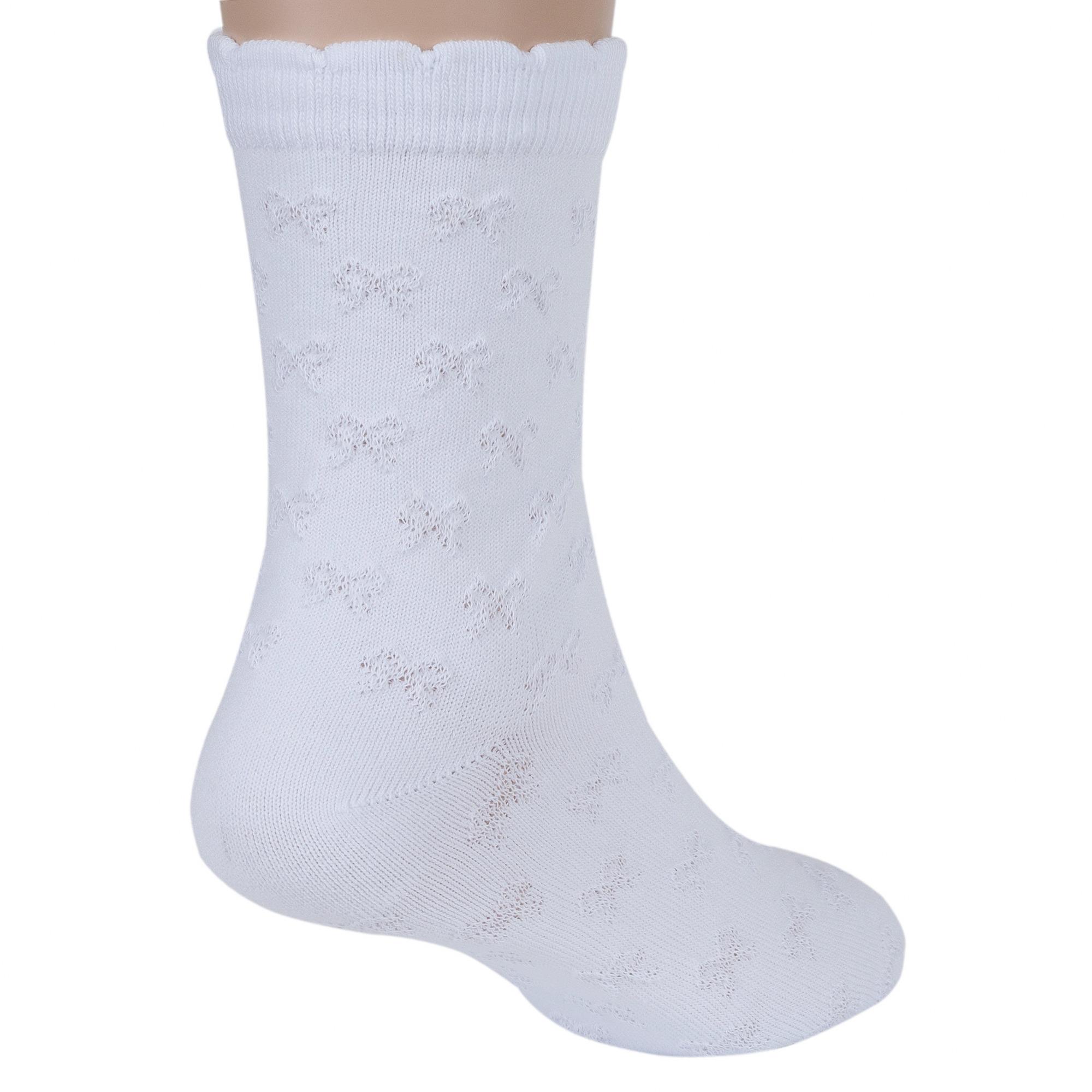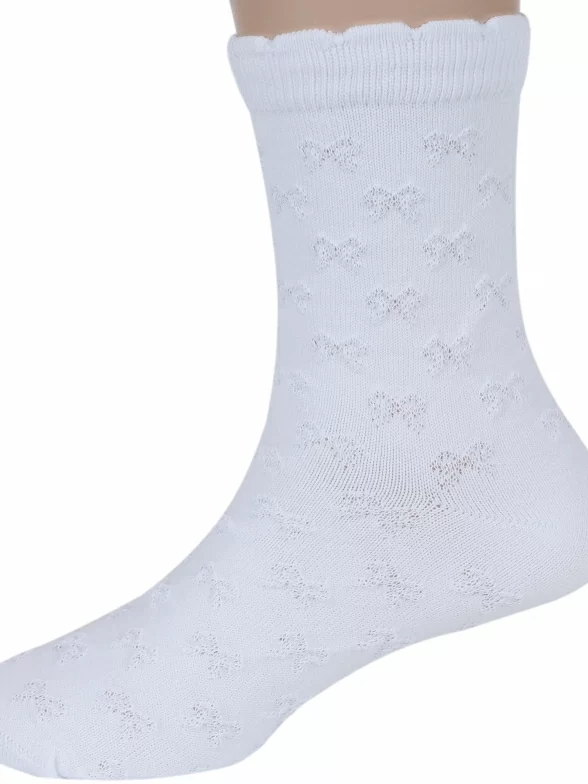 Летние укороченные детские носки, цвет белый, повседневные, шов кеттельный (бесшовная технология), принт (рисунок): бабочки / бантики, с узором, однотонный, состав: 78% хлопок, 20% полиамид, 2% эластан, арт. Д3-13028. Производитель «ООО Орудьевский трикотаж, Россия» под брендом «Rusocks (орудьевский трикотаж)».