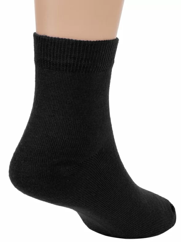 Круглогодичные или летние укороченные детские носки, цвет черный, классические, шов кеттельный (бесшовная технология), принт (рисунок): однотонный, без рисунков/узоров, состав: 87% хлопок, 10% полиамид, 3% эластан, арт. Д-3135. Производитель «ООО Орудьевский трикотаж, Россия» под брендом «Rusocks (орудьевский трикотаж)».