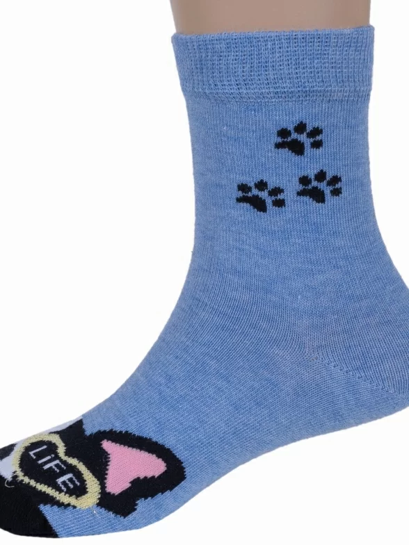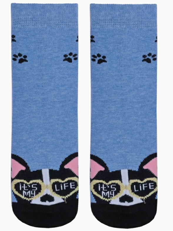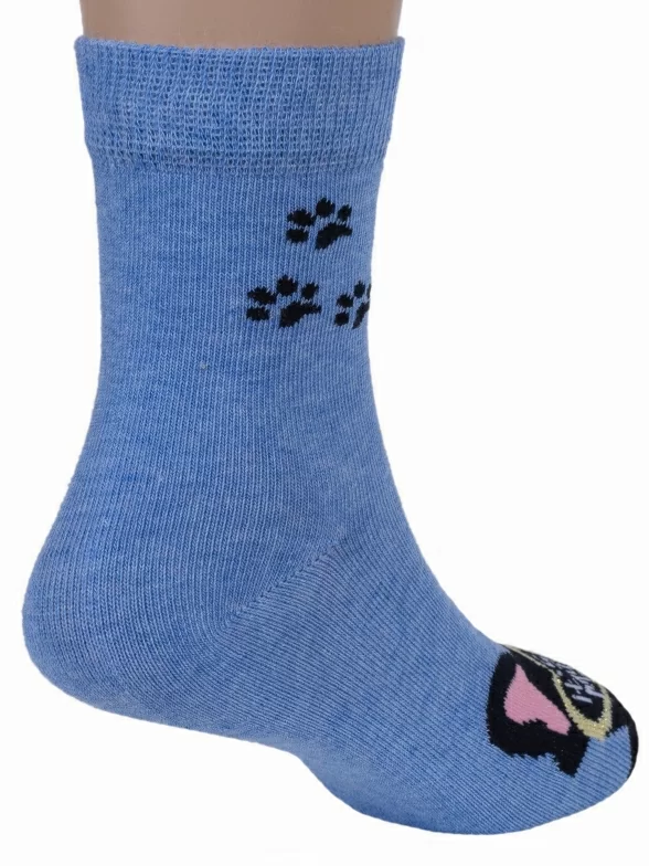 Круглогодичные укороченные детские носки, цвет синий-джинс, с нескользящей стопой, повседневные, шов кеттельный (бесшовная технология), принт (рисунок): животные, с узором, состав: 78% хлопок, 20% полиамид, 2% эластан, арт. Д3-13156. Производитель «ООО Орудьевский трикотаж, Россия» под брендом «Rusocks (орудьевский трикотаж)».