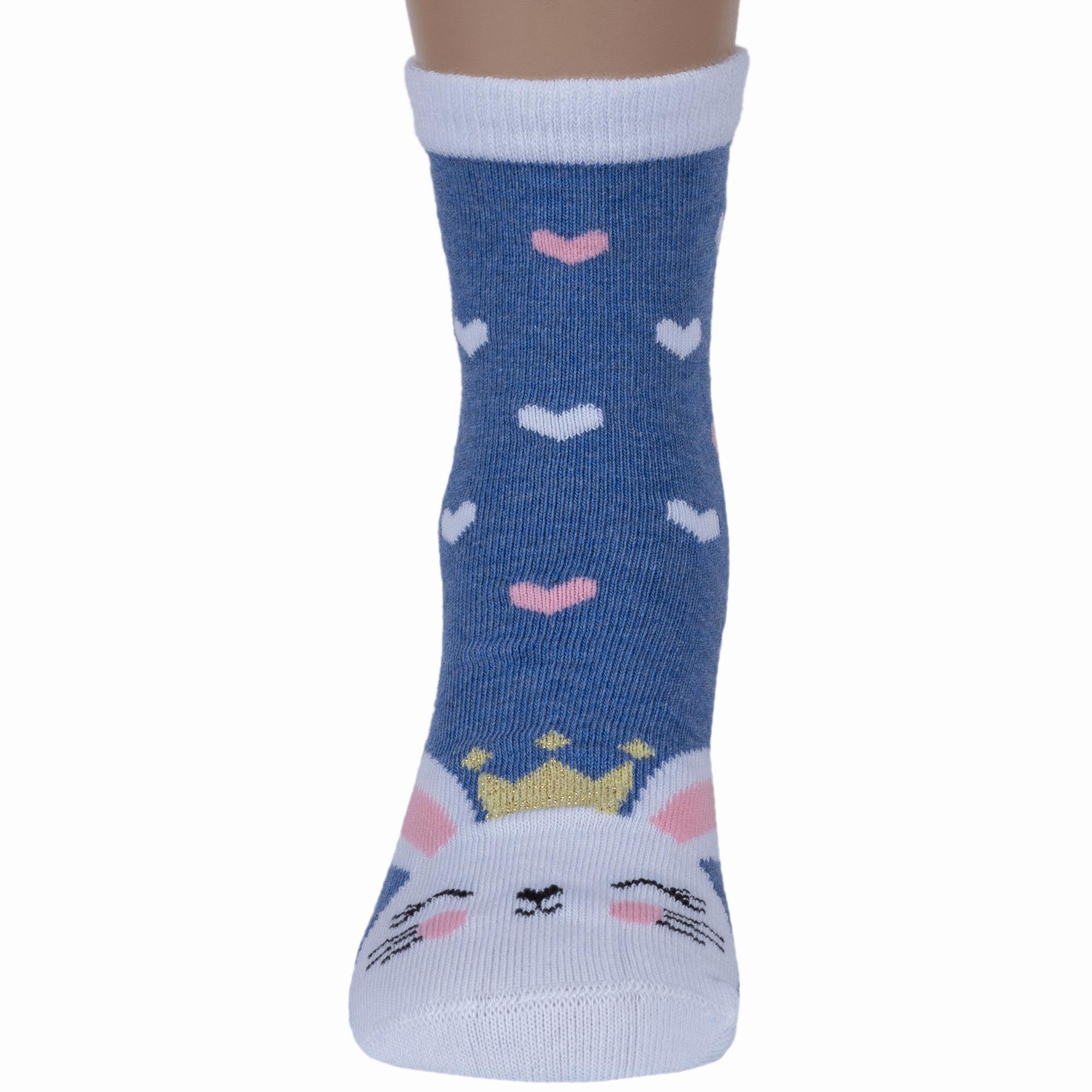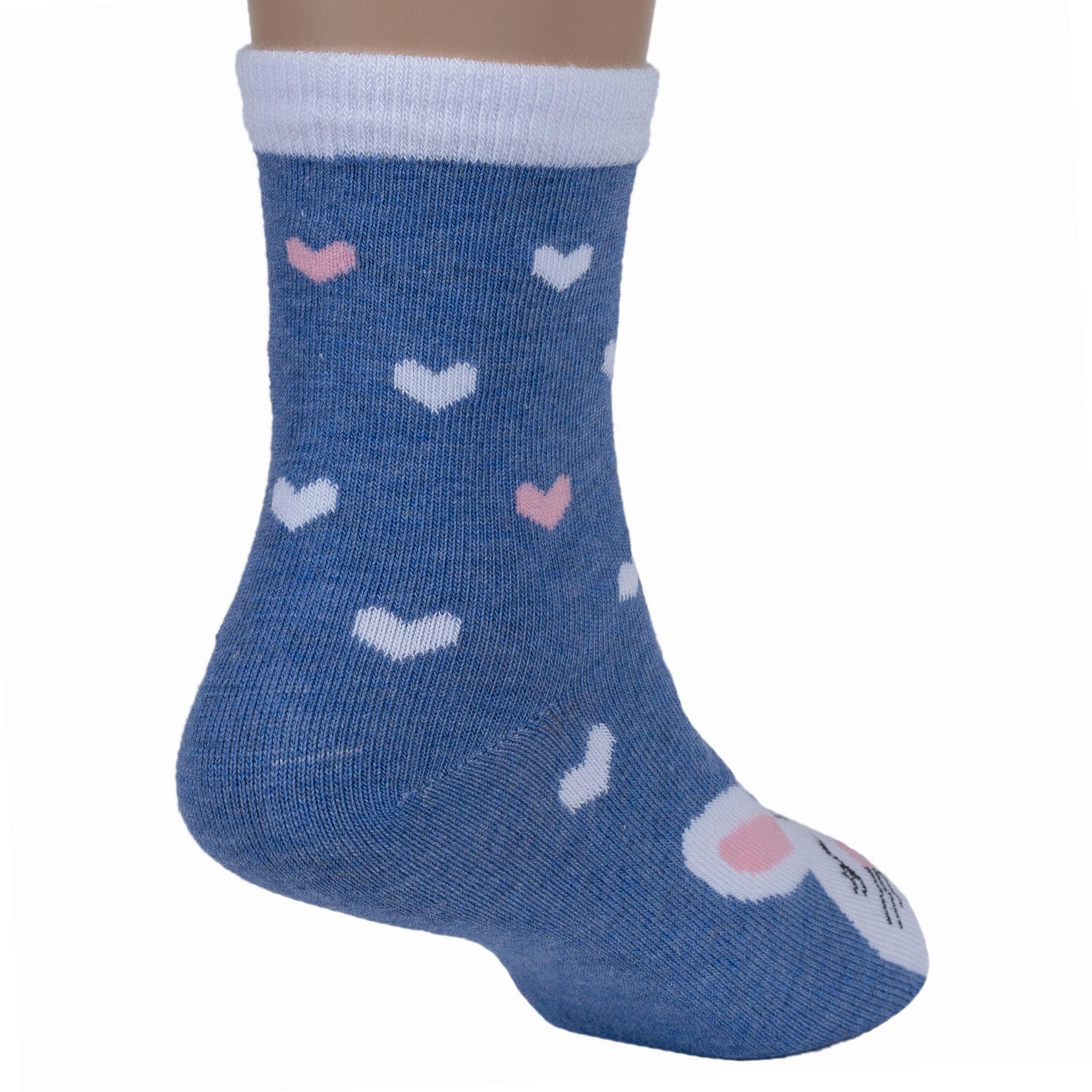 Круглогодичные укороченные детские носки, цвет синий-джинс, с нескользящей стопой, повседневные, шов кеттельный (бесшовная технология), принт (рисунок): животные, с узором, состав: 78% хлопок, 20% полиамид, 2% эластан, арт. Д3-13055. Производитель «ООО Орудьевский трикотаж, Россия» под брендом «Rusocks (орудьевский трикотаж)».