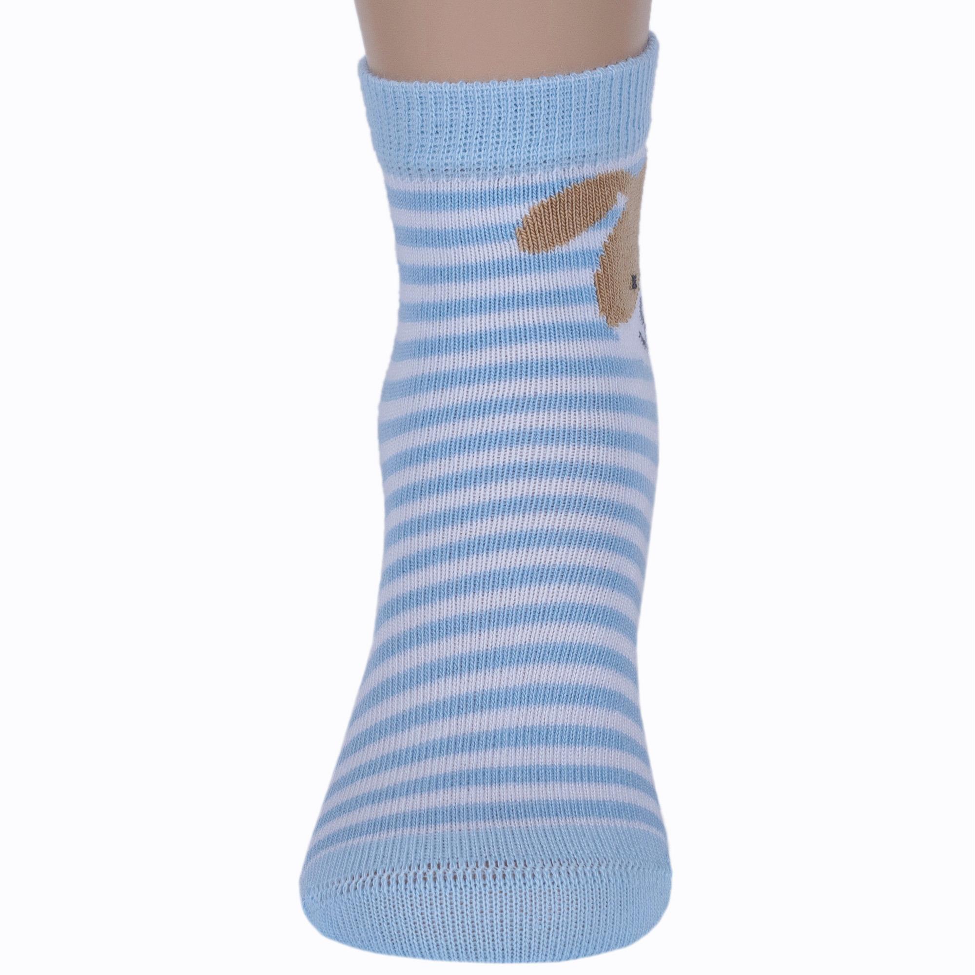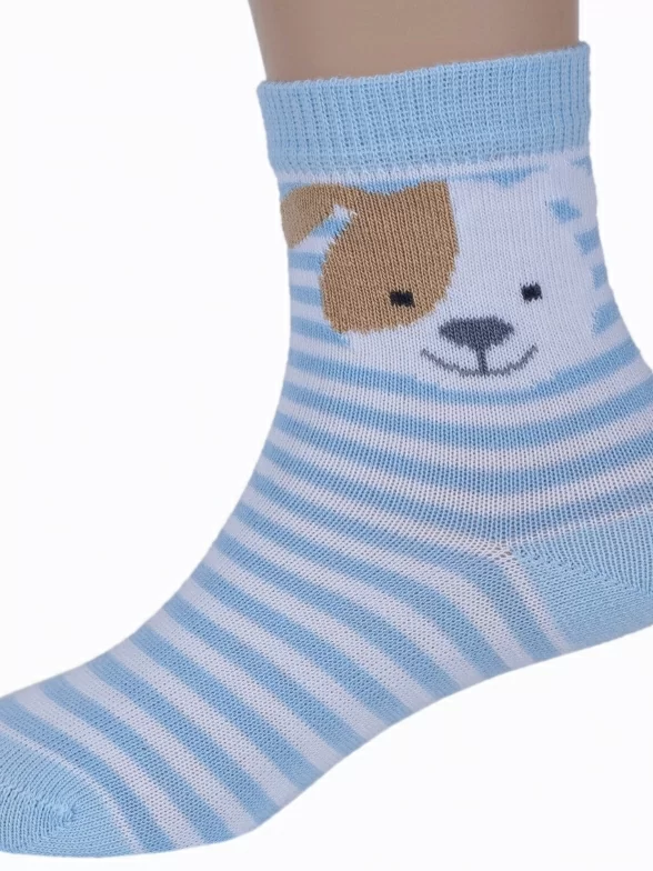 Круглогодичные укороченные детские носки, цвет голубой, повседневные, шов кеттельный (бесшовная технология), принт (рисунок): животные, с узором, крупные контрастные рисунки, состав: 78% хлопок, 20% полиамид, 2% эластан, арт. Д3-13788. Производитель «ООО Орудьевский трикотаж, Россия» под брендом «Rusocks (орудьевский трикотаж)».