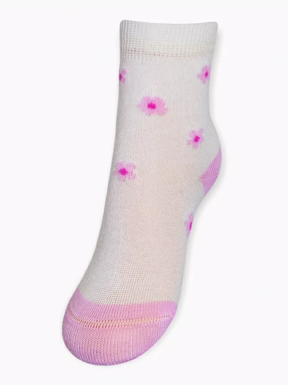 Круглогодичные укороченные детские носки, цвет кремовый, повседневные, шов кеттельный (бесшовная технология), принт (рисунок): цветы / растения, с узором, состав: 78% хлопок, 20% полиамид, 2% эластан, арт. Д3-13793. Производитель «ООО Орудьевский трикотаж, Россия» под брендом «Rusocks (орудьевский трикотаж)».