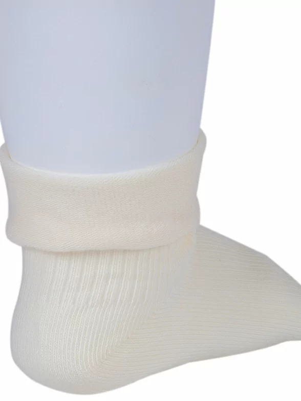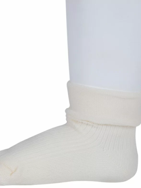 Круглогодичные укороченные детские носки, цвет кремовый-бежевый, с отворотом, классические, шов кеттельный (бесшовная технология), принт (рисунок): в рубчик, однотонный, состав: 88% хлопок, 10% полиамид, 2% эластан, арт. Д-107. Производитель «ООО Орудьевский трикотаж, Россия» под брендом «Rusocks (орудьевский трикотаж)».
