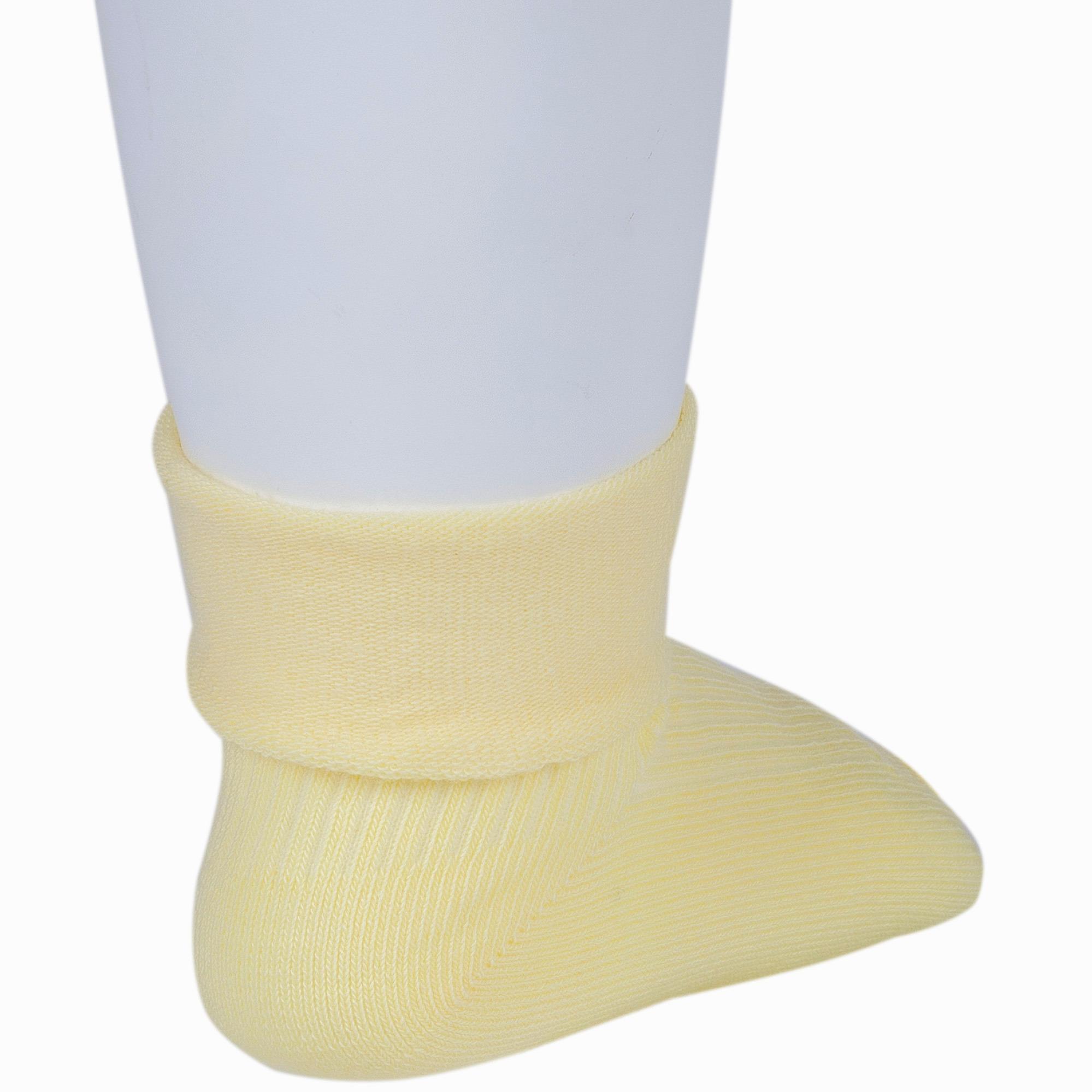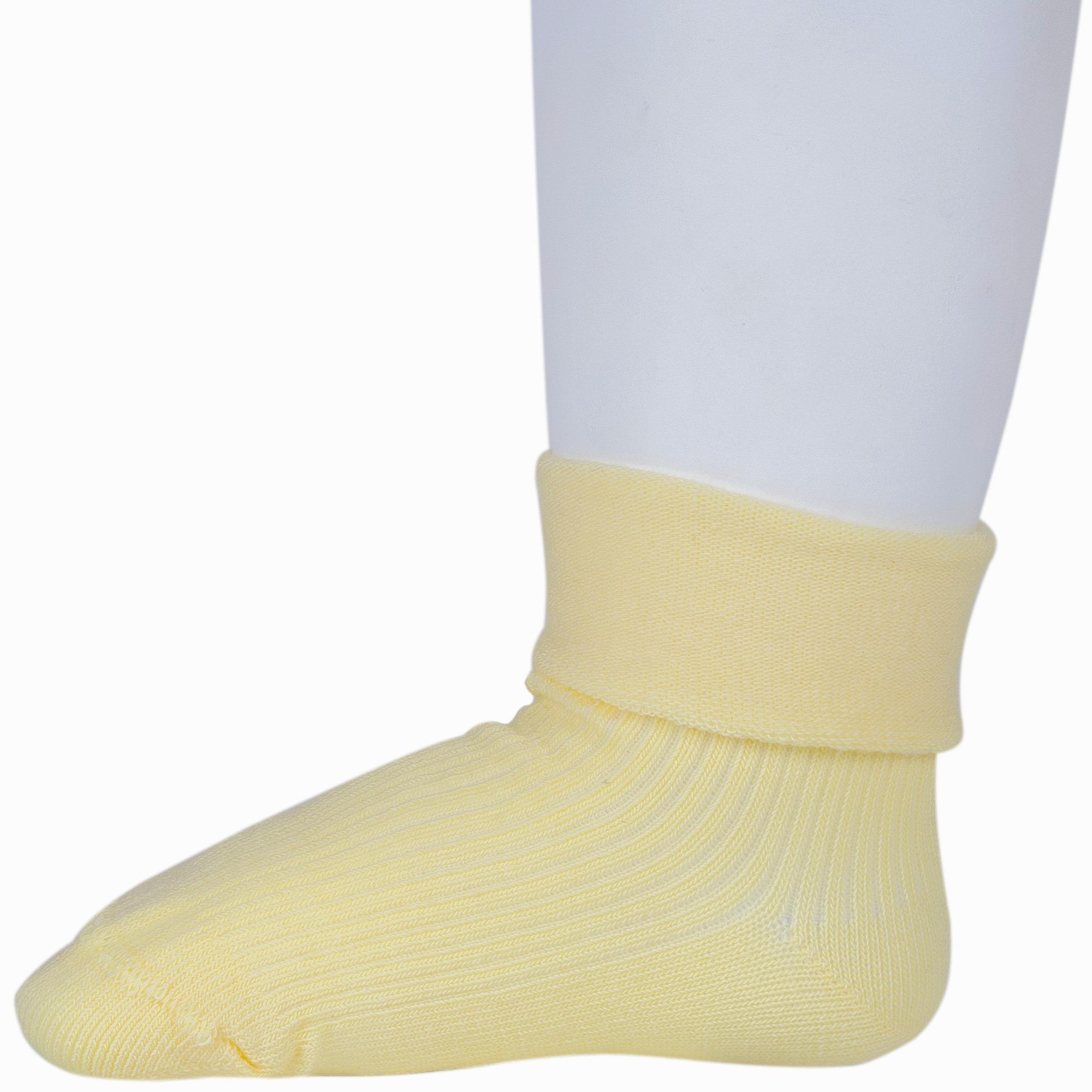 Круглогодичные укороченные детские носки, цвет желтый, с отворотом, классические, шов кеттельный (бесшовная технология), принт (рисунок): в рубчик, однотонный, состав: 88% хлопок, 10% полиамид, 2% эластан, арт. Д-107. Производитель «ООО Орудьевский трикотаж, Россия» под брендом «Rusocks (орудьевский трикотаж)».