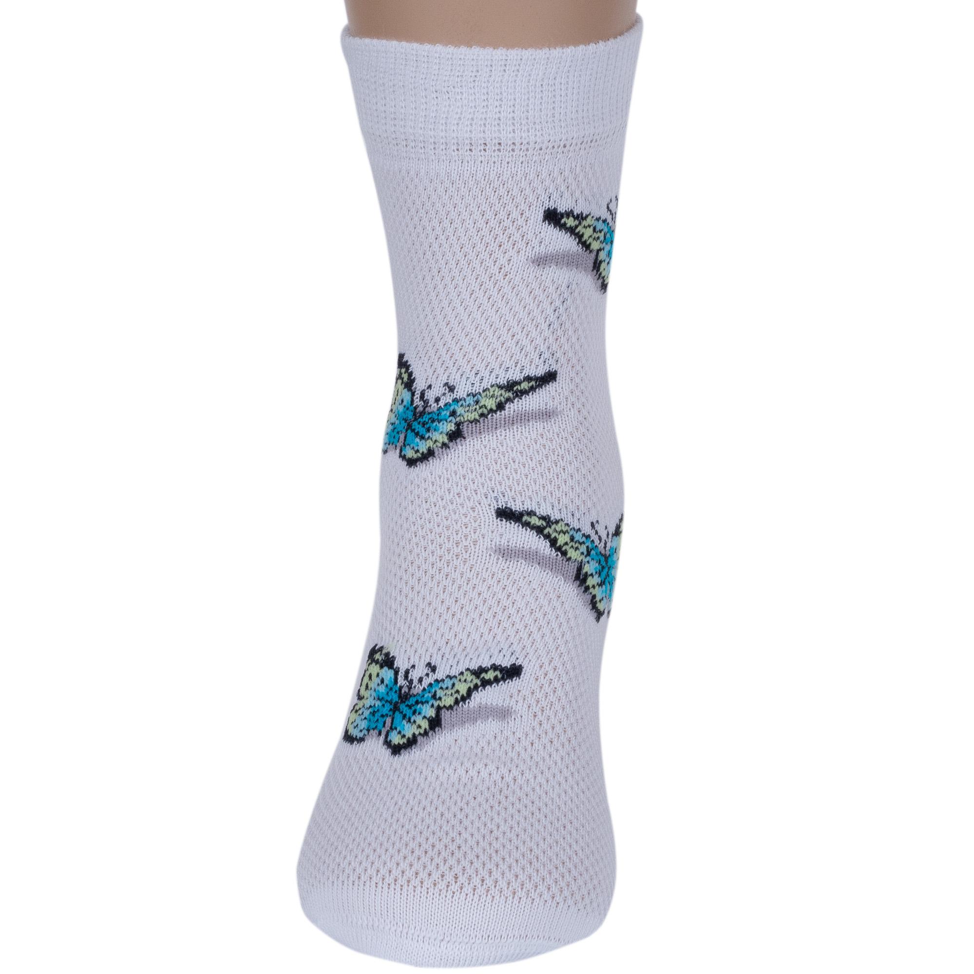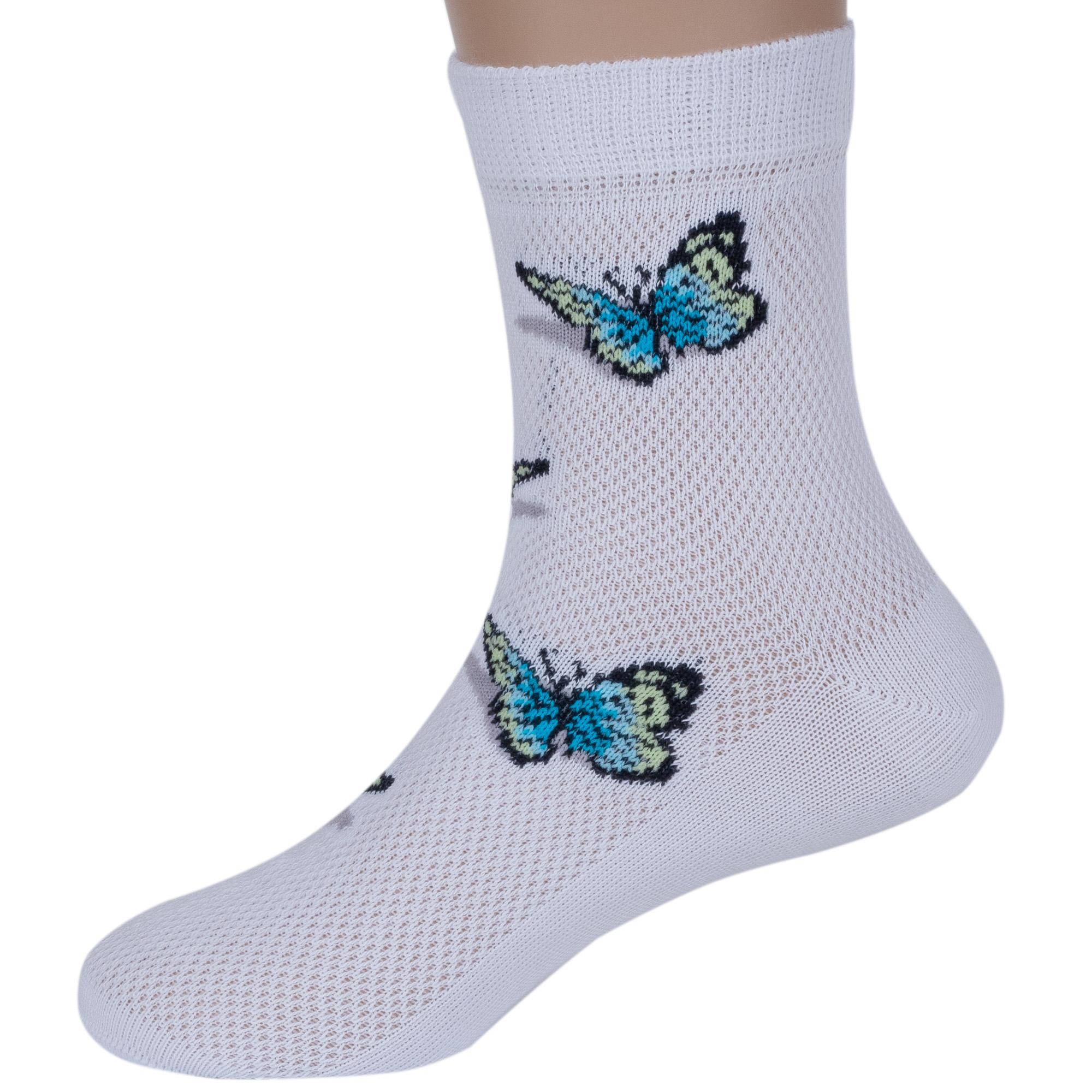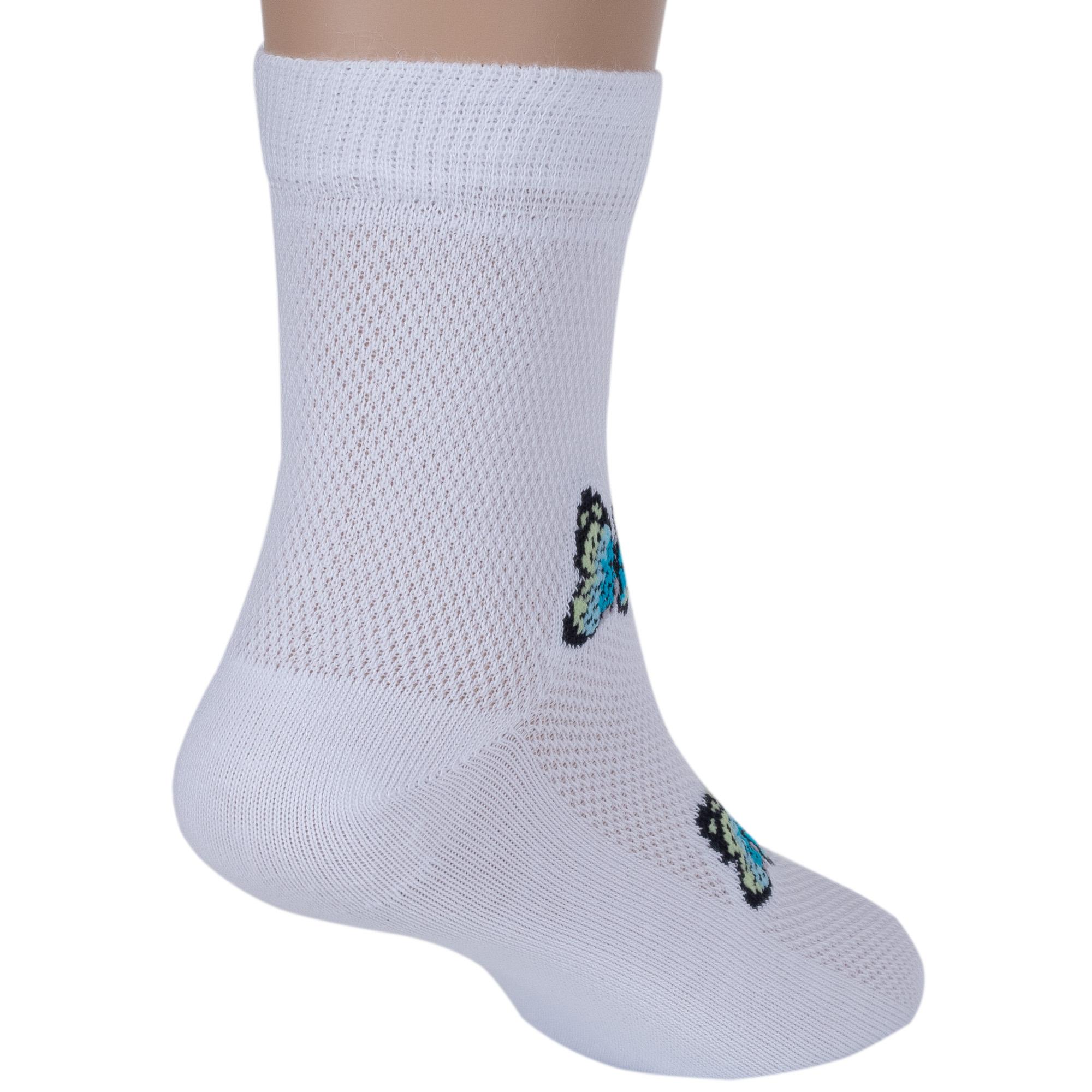 Летние укороченные детские носки, цвет белый, в сеточку, повседневные, шов кеттельный (бесшовная технология), принт (рисунок): бабочки / бантики, с узором, состав: 80% хлопок, 20% полиамид, арт. Д-221. Производитель «ООО Орудьевский трикотаж, Россия» под брендом «Rusocks (орудьевский трикотаж)».