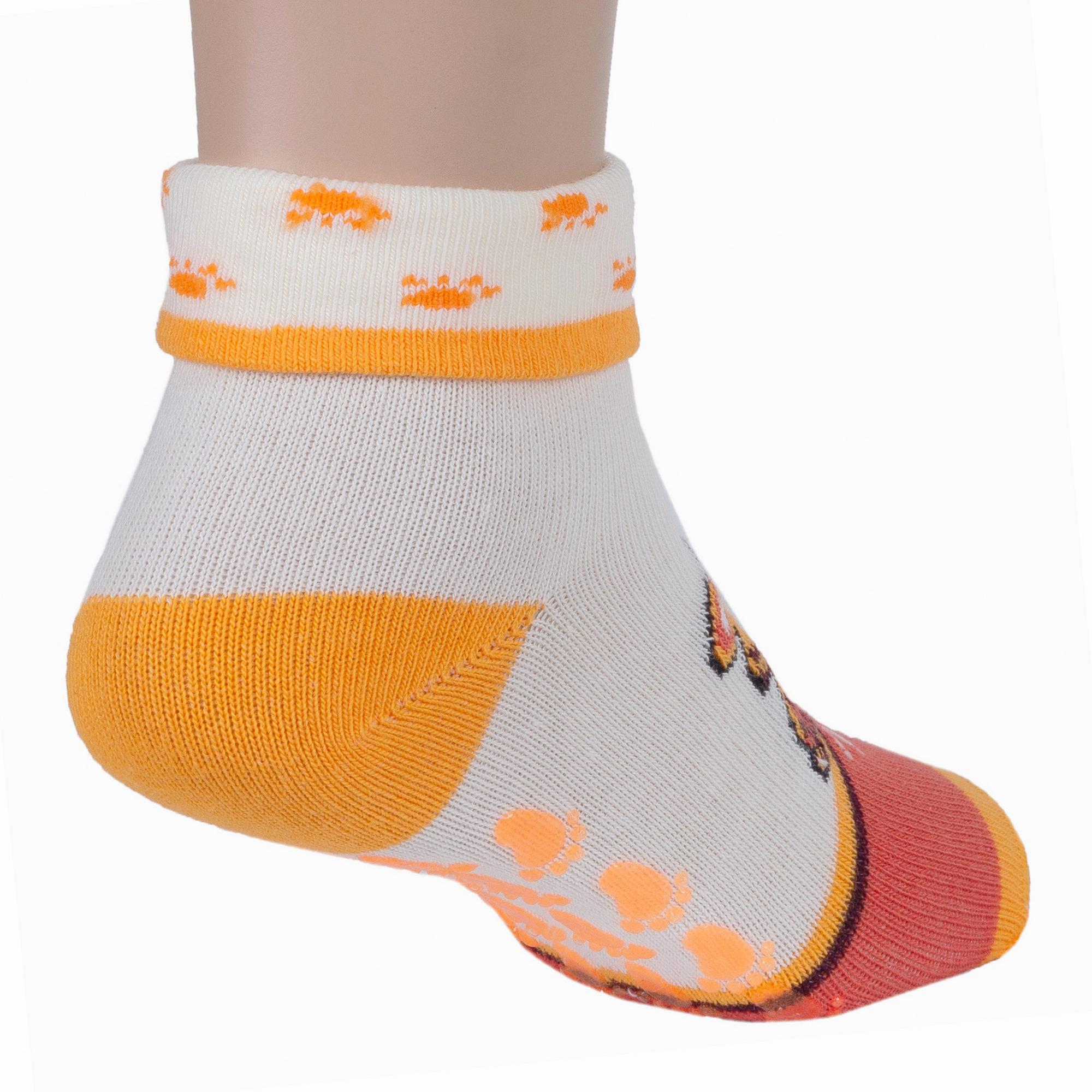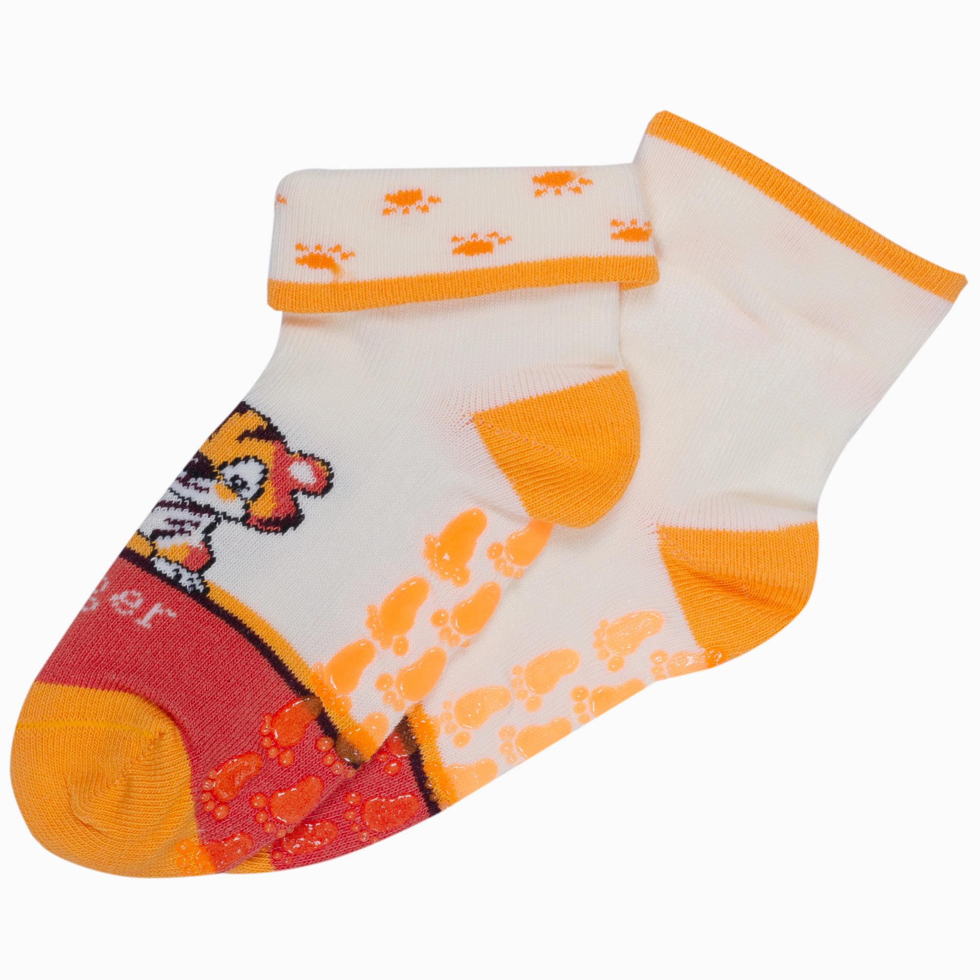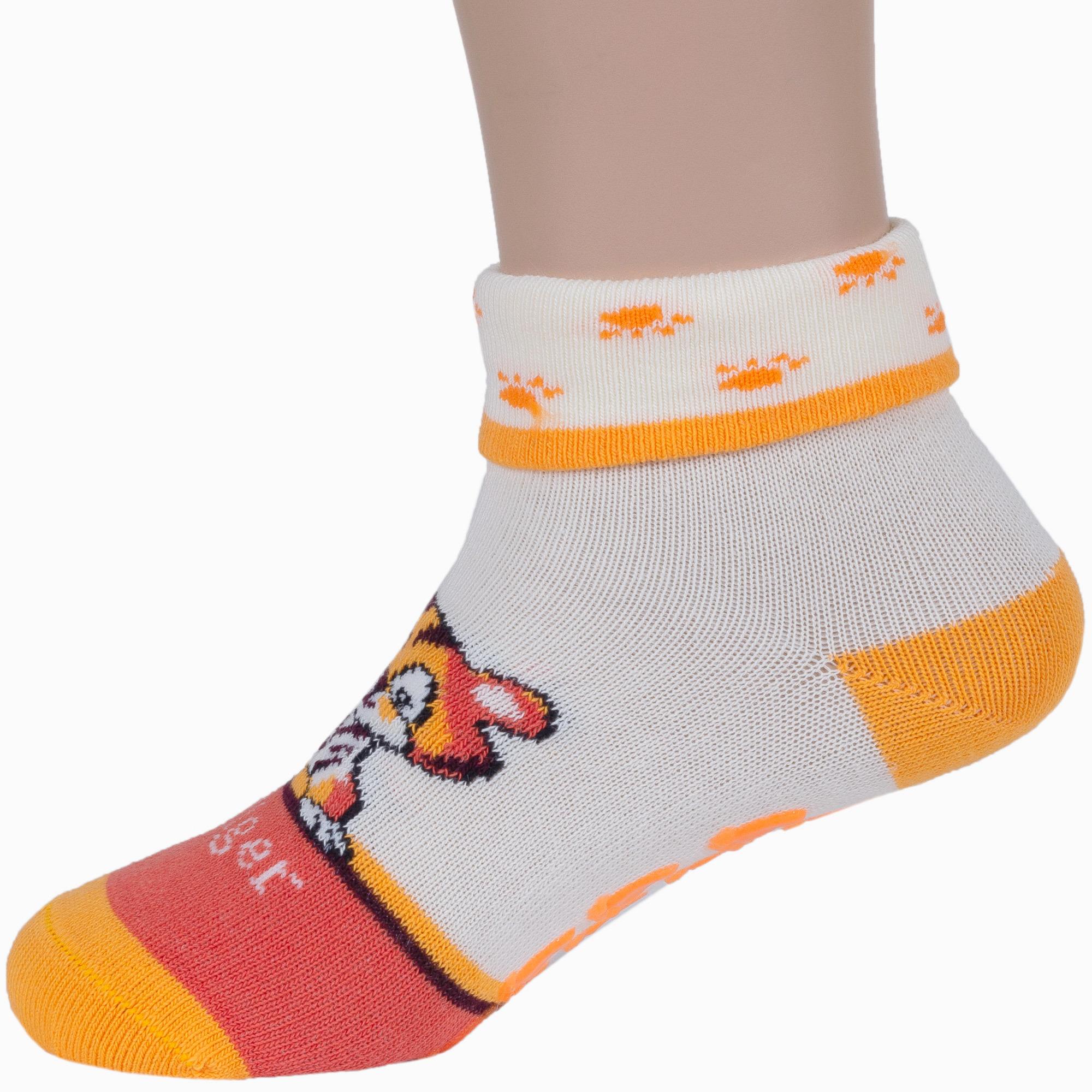 Круглогодичные укороченные детские носки, цвет многоцветные (мультиколор), с отворотом, с нескользящей стопой, повседневные, шов кеттельный (бесшовная технология), принт (рисунок): животные, с узором, крупные контрастные рисунки, состав: 78% хлопок, 20% полиамид, 2% эластан, арт. ДТ-95. Производитель «ООО Орудьевский трикотаж, Россия» под брендом «Rusocks (орудьевский трикотаж)».