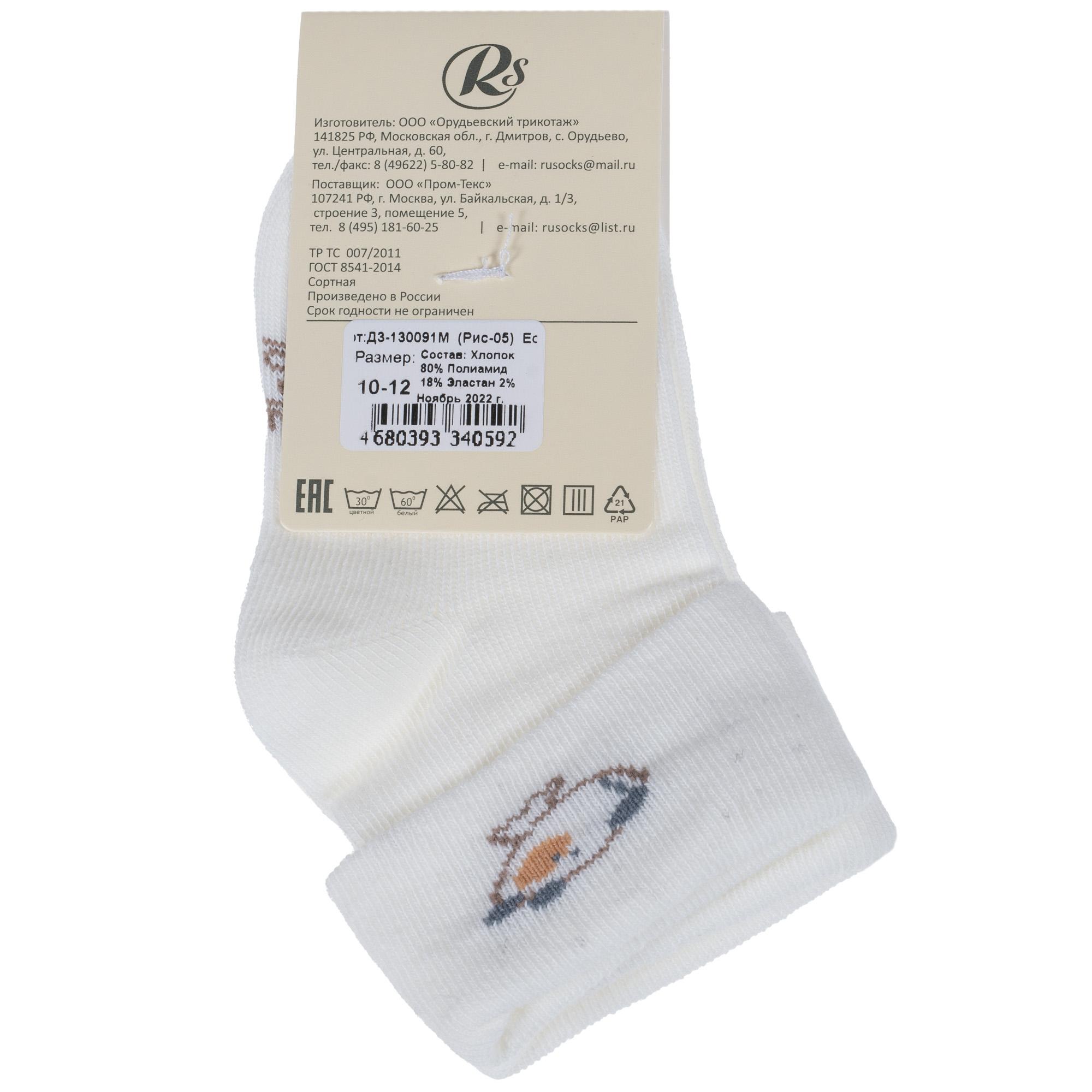Круглогодичные укороченные детские носки, цвет кремовый, с отворотом, повседневные, шов кеттельный (бесшовная технология), принт (рисунок): животные, однотонный, небольшой рисунок, состав: 80% хлопок, 18% полиамид, 2% эластан, арт. Д3-130091М. Производитель «ООО Орудьевский трикотаж, Россия» под брендом «Rusocks (орудьевский трикотаж)».