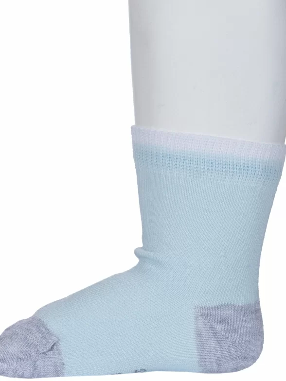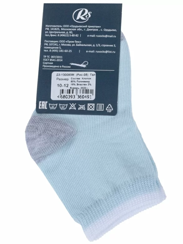 Круглогодичные укороченные детские носки, цвет голубой, классические, шов кеттельный (бесшовная технология), принт (рисунок): контрастные пятка / мысок / резинка, однотонный, без рисунков/узоров, состав: 80% хлопок, 18% полиамид, 2% эластан, арт. Д3-130093М. Производитель «ООО Орудьевский трикотаж, Россия» под брендом «Rusocks (орудьевский трикотаж)».