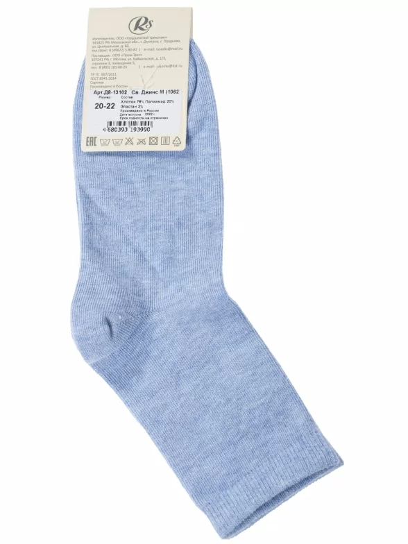 Круглогодичные укороченные детские носки, цвет голубой, классические, шов кеттельный (бесшовная технология), принт (рисунок): однотонный, без рисунков/узоров, состав: 78% хлопок, 20% полиамид, 2% эластан, арт. Д8-13102. Производитель «ООО Орудьевский трикотаж, Россия» под брендом «Rusocks (орудьевский трикотаж)».