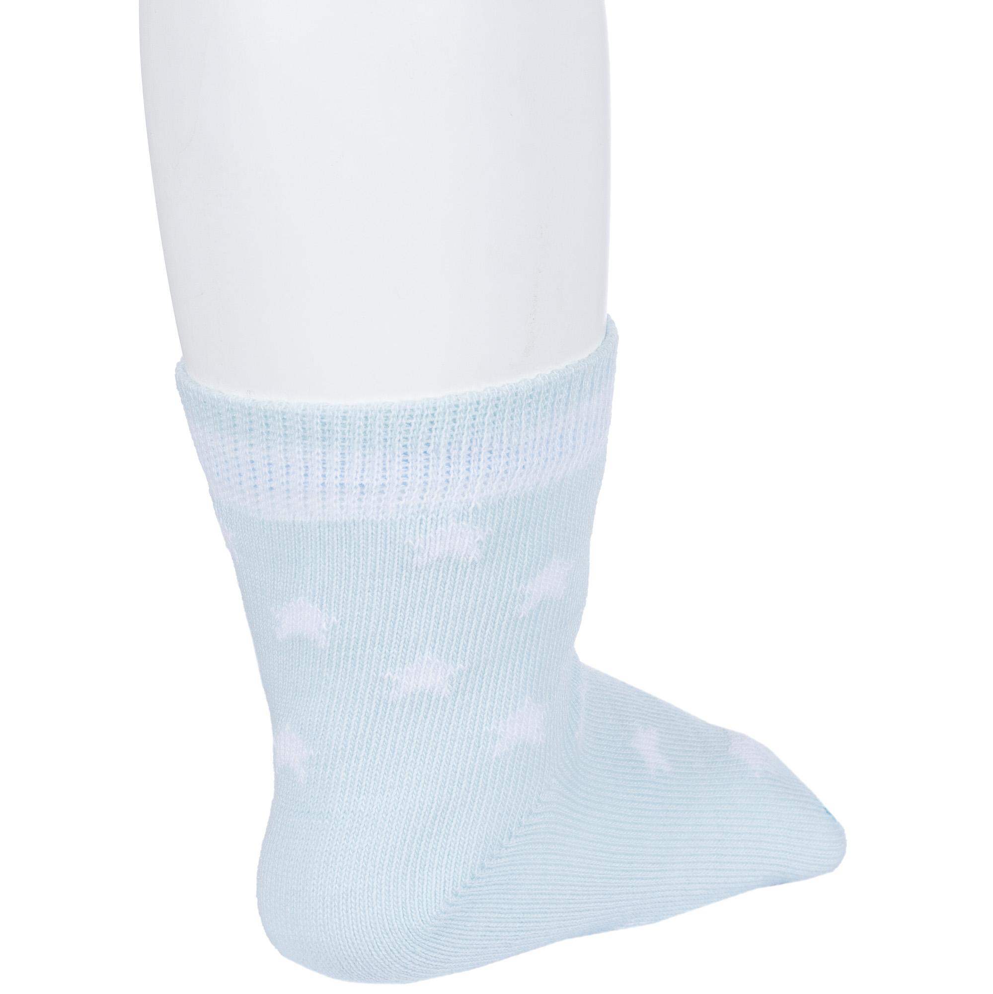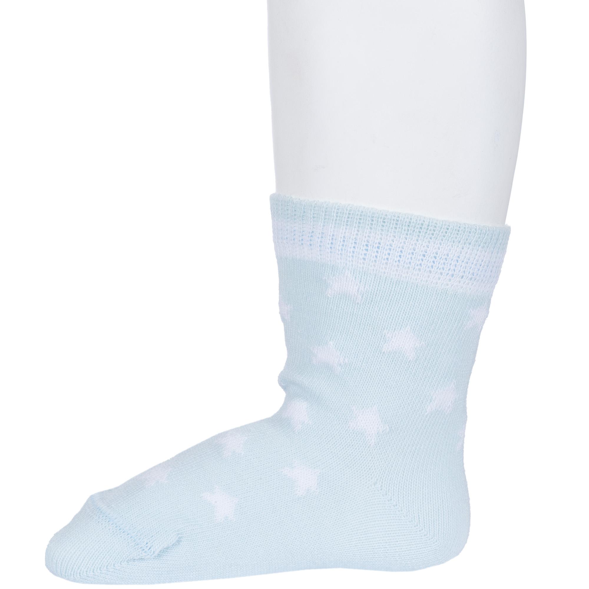 Круглогодичные укороченные детские носки, цвет голубой, повседневные, шов кеттельный (бесшовная технология), принт (рисунок): мелкий принт, контрастные пятка / мысок / резинка, звезды / небо, с узором, состав: 80% хлопок, 18% полиамид, 2% эластан, арт. Д3-130093М. Производитель «ООО Орудьевский трикотаж, Россия» под брендом «Rusocks (орудьевский трикотаж)».