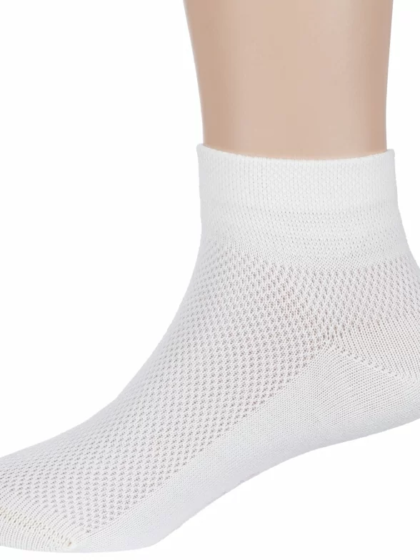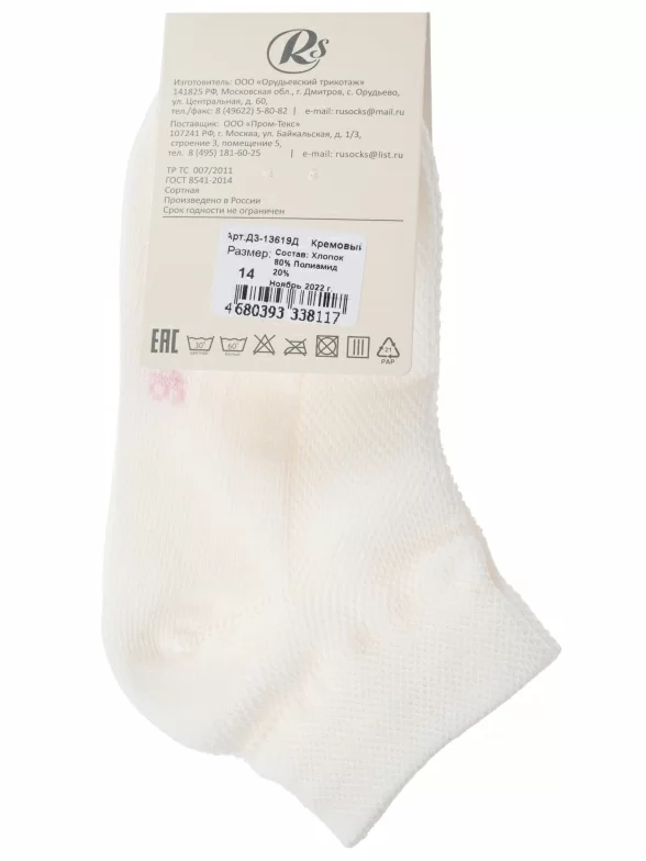 Летние короткие детские носки, цвет кремовый, в сеточку, спортивные, классические, конструкция без шва, принт (рисунок): однотонный, без рисунков/узоров, состав: 80% хлопок, 20% полиамид, арт. Д3-13619Д. Производитель «ООО Орудьевский трикотаж, Россия» под брендом «Rusocks (орудьевский трикотаж)».