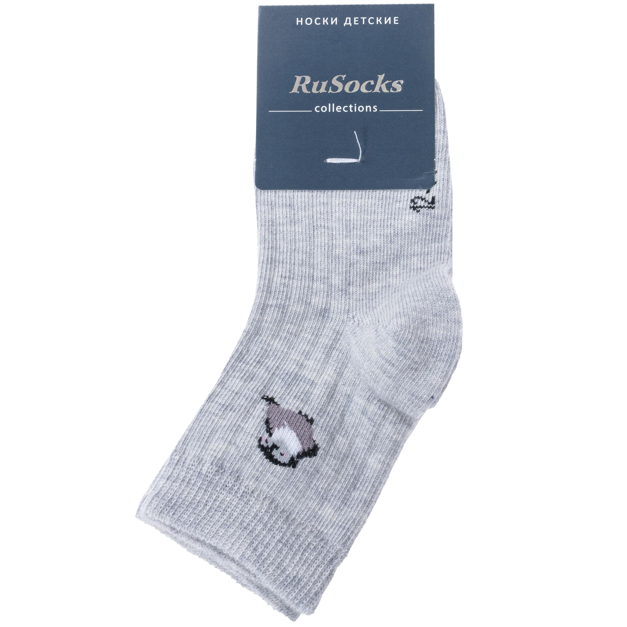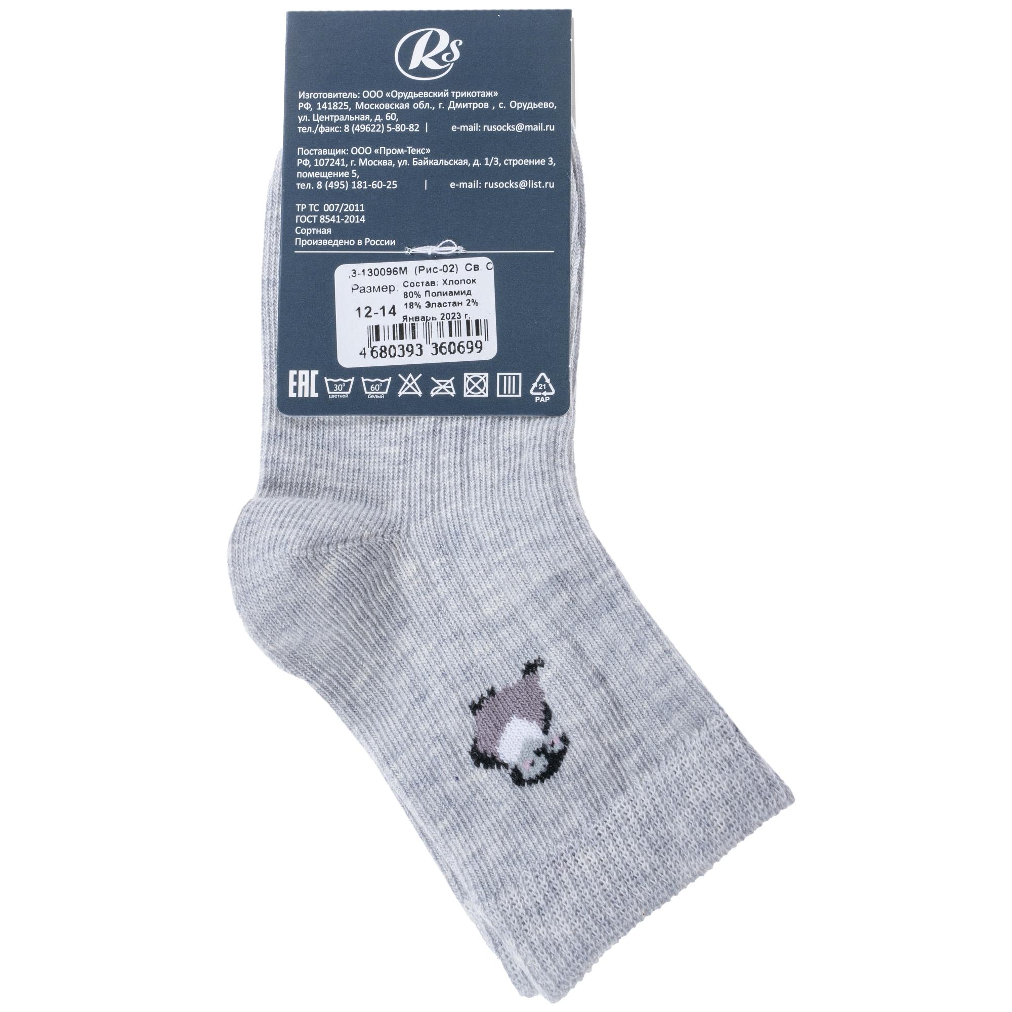 Круглогодичные укороченные детские носки, цвет светло-серый, повседневные, шов кеттельный (бесшовная технология), принт (рисунок): животные, в рубчик, с узором, небольшой рисунок, состав: 80% хлопок, 18% полиамид, 2% эластан, арт. Д3-130096М. Производитель «ООО Орудьевский трикотаж, Россия» под брендом «Rusocks (орудьевский трикотаж)».