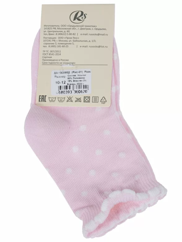 Круглогодичные укороченные детские носки, цвет розовый, классические, шов кеттельный (бесшовная технология), принт (рисунок): контрастные пятка / мысок / резинка, горох / точка, с узором, состав: 80% хлопок, 18% полиамид, 2% эластан, арт. Д3-130095Д. Производитель «ООО Орудьевский трикотаж, Россия» под брендом «Rusocks (орудьевский трикотаж)».