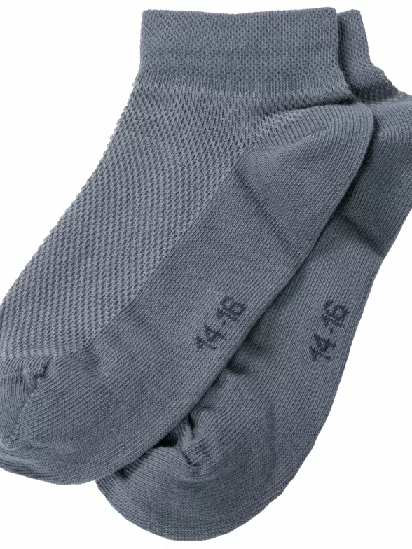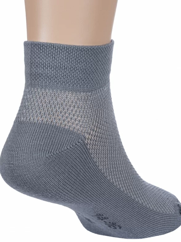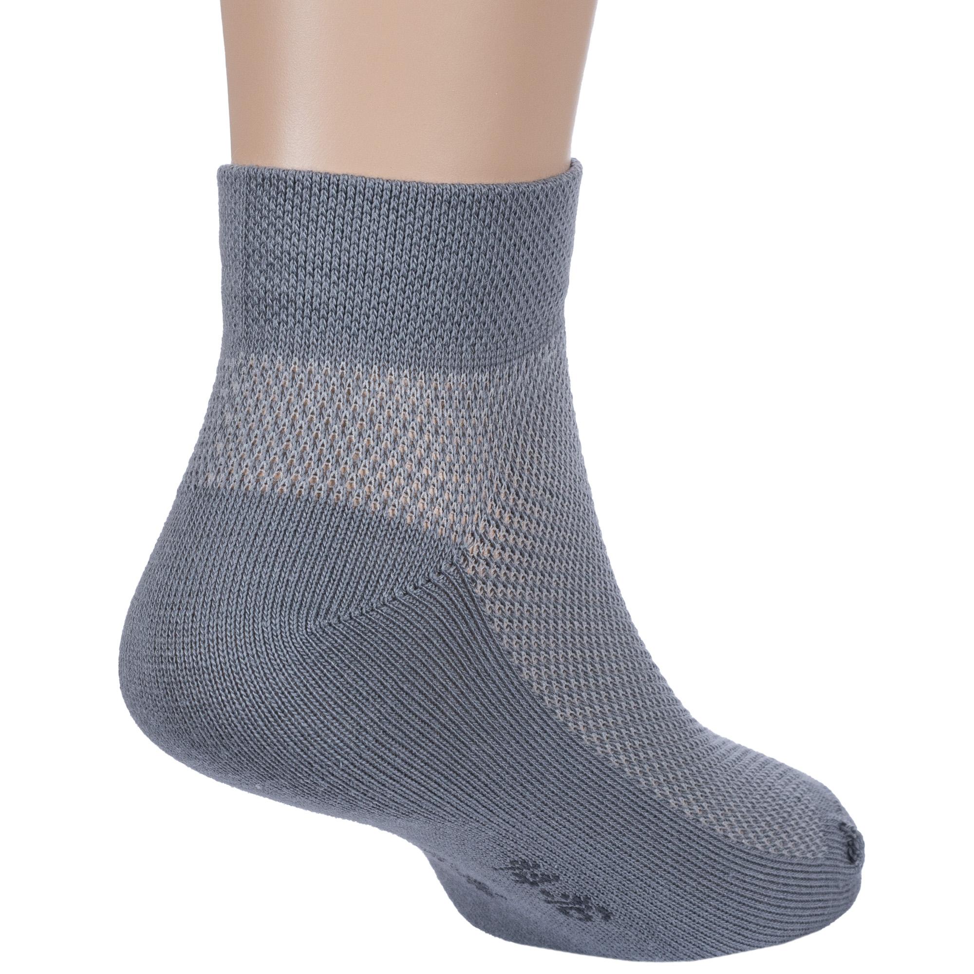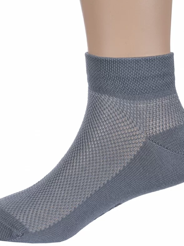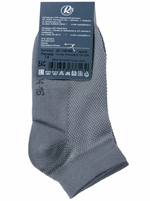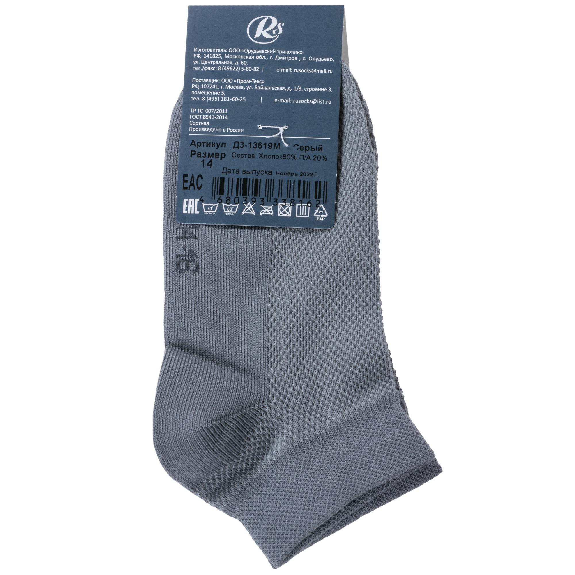 Летние короткие детские носки, цвет серый, в сеточку, спортивные, классические, конструкция без шва, принт (рисунок): однотонный, без рисунков/узоров, состав: 80% хлопок, 20% полиамид, арт. Д3-13619М. Производитель «ООО Орудьевский трикотаж, Россия» под брендом «Rusocks (орудьевский трикотаж)».