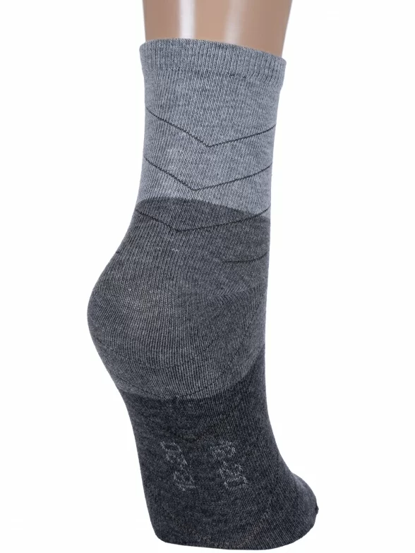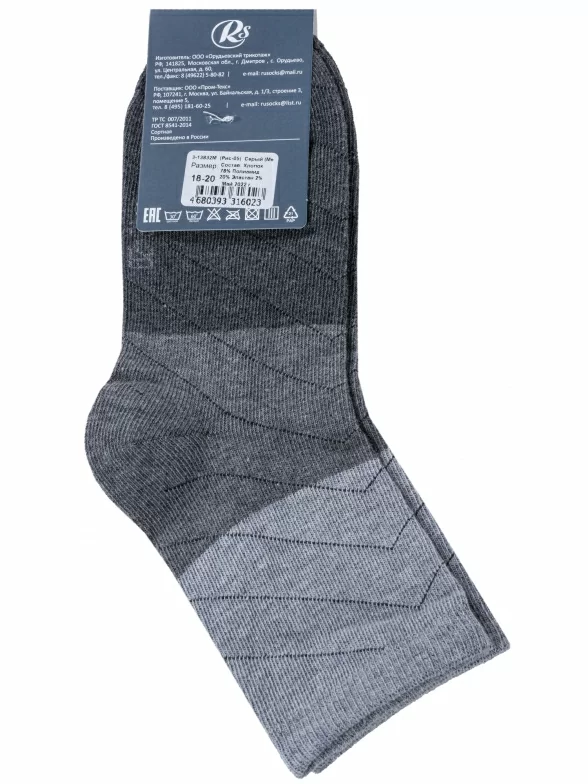 Круглогодичные укороченные детские носки, цвет серый, классические, конструкция без шва, принт (рисунок): полоски, с узором, состав: 78% хлопок, 20% полиамид, 2% эластан, арт. Д3-13832М. Производитель «ООО Орудьевский трикотаж, Россия» под брендом «Rusocks (орудьевский трикотаж)».