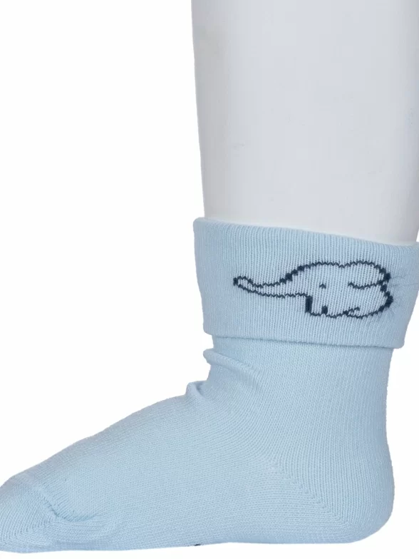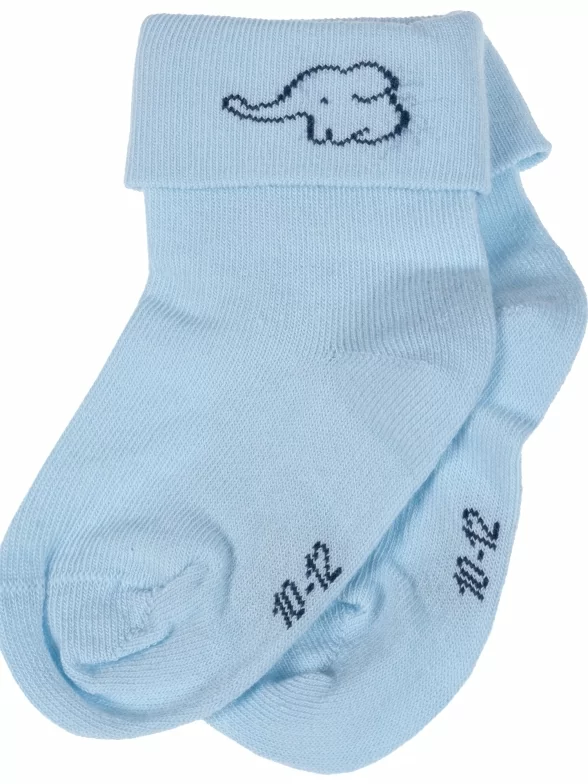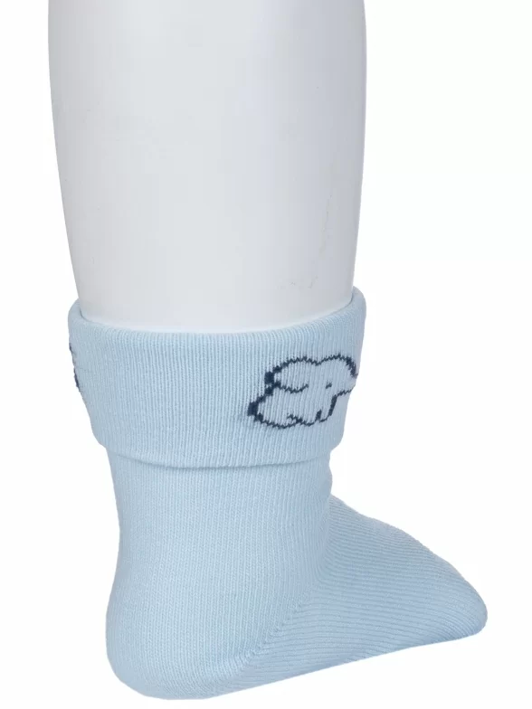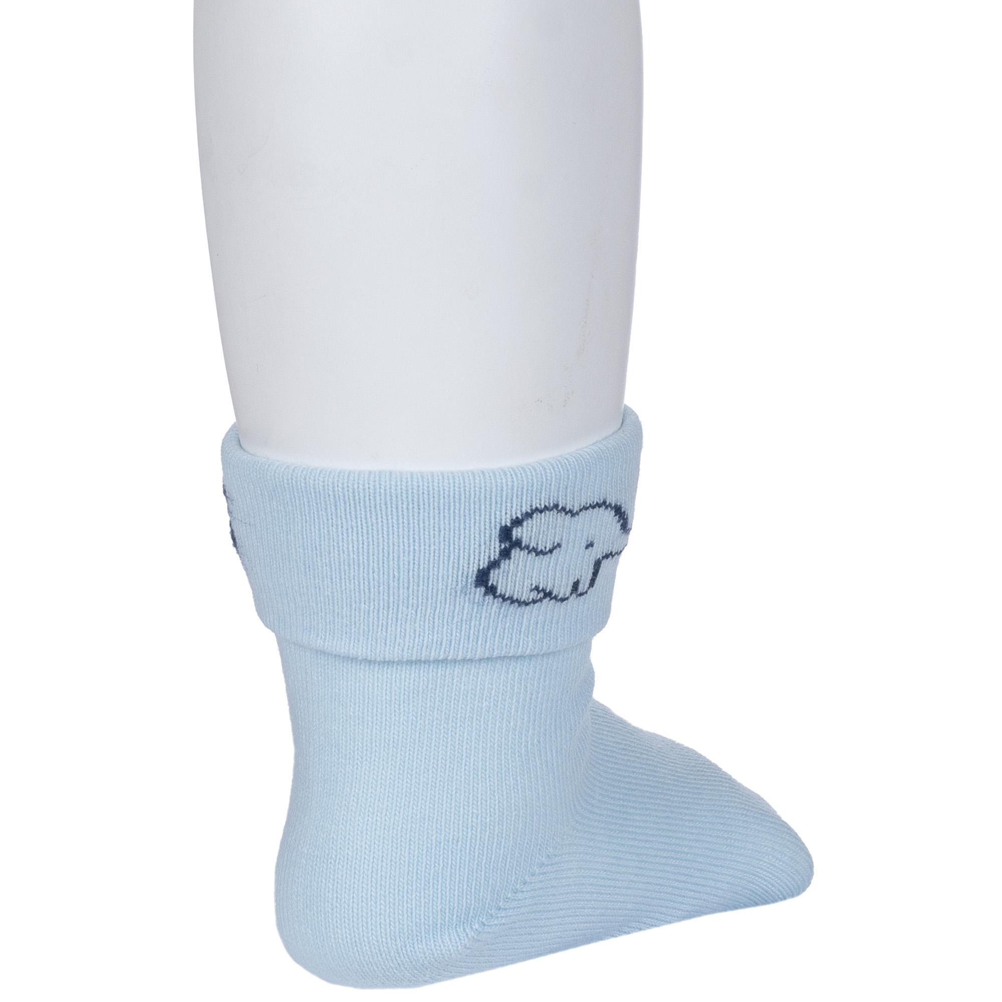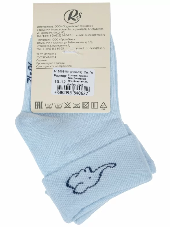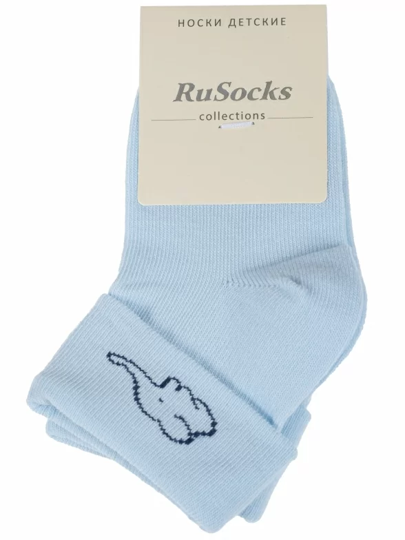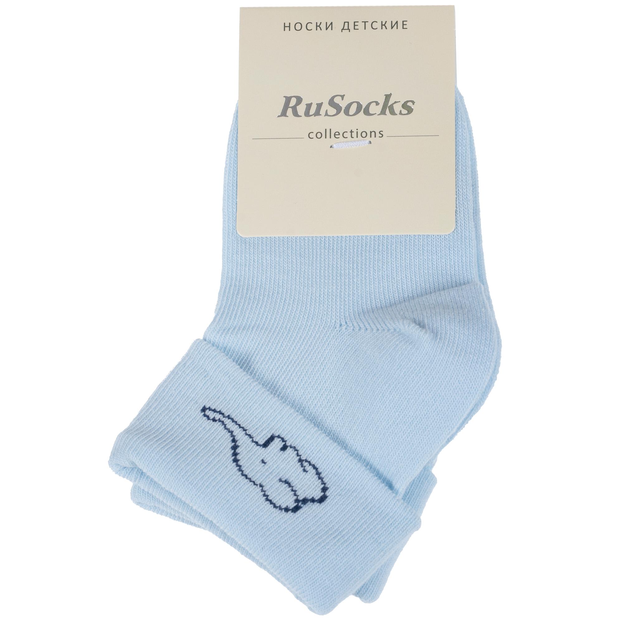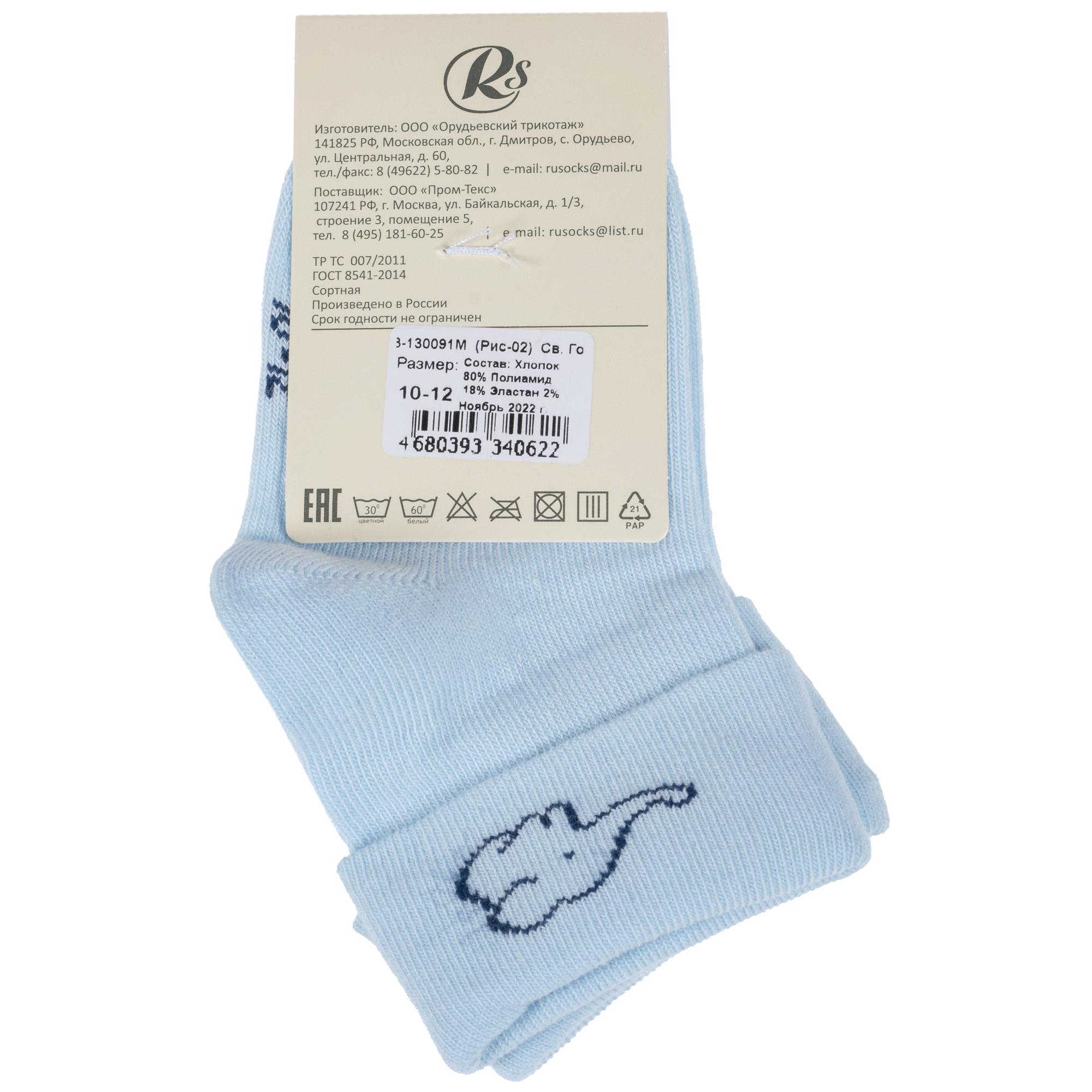 Круглогодичные укороченные детские носки, цвет голубой, с отворотом, повседневные, шов кеттельный (бесшовная технология), принт (рисунок): животные, однотонный, небольшой рисунок, состав: 80% хлопок, 18% полиамид, 2% эластан, арт. Д3-130091М. Производитель «ООО Орудьевский трикотаж, Россия» под брендом «Rusocks (орудьевский трикотаж)».