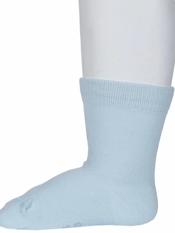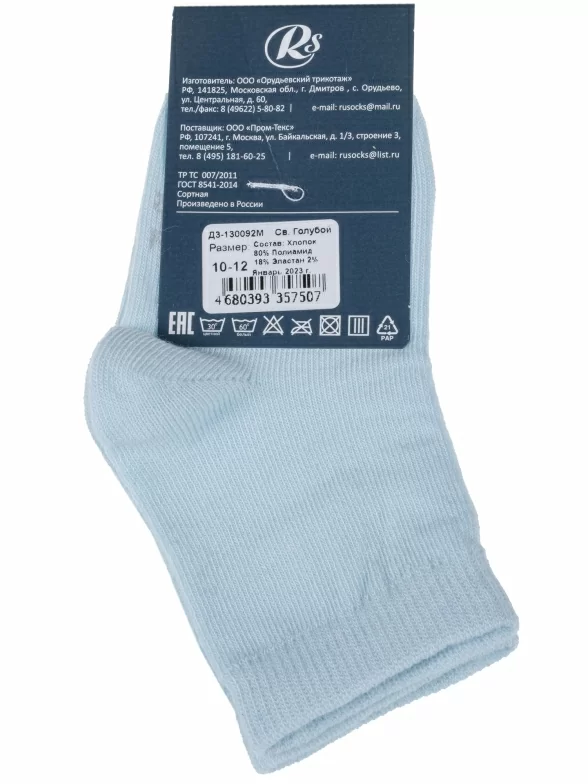 Круглогодичные средней длины детские носки, цвет голубой, классические, шов кеттельный (бесшовная технология), принт (рисунок): однотонный, без рисунков/узоров, состав: 80% хлопок, 18% полиамид, 2% эластан, арт. Д3-130092М. Производитель «ООО Орудьевский трикотаж, Россия» под брендом «Rusocks (орудьевский трикотаж)».