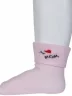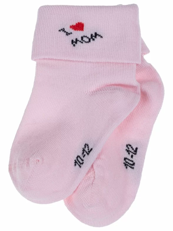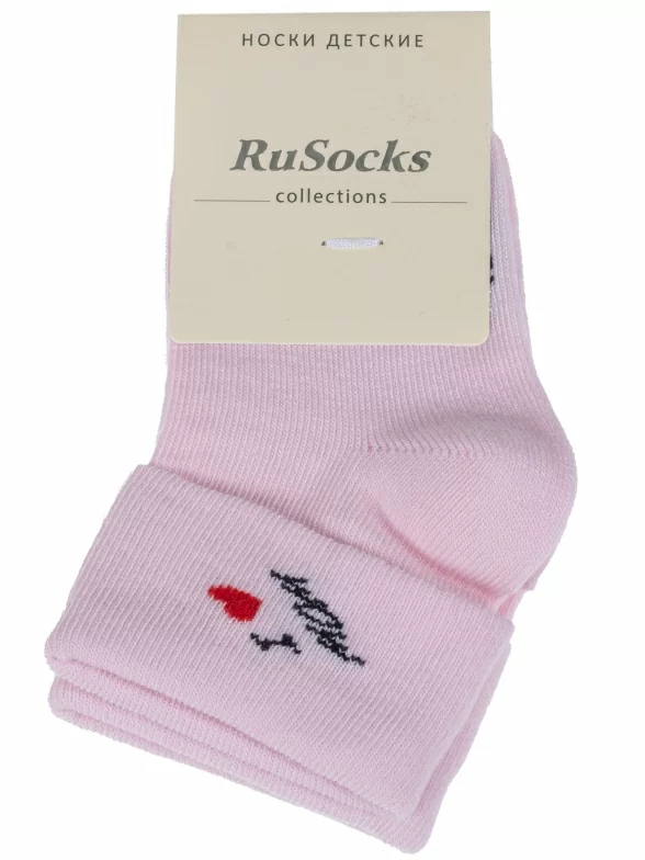 Круглогодичные укороченные детские носки, цвет розовый, с отворотом, повседневные, шов кеттельный (бесшовная технология), принт (рисунок): надписи, однотонный, небольшой рисунок, состав: 80% хлопок, 18% полиамид, 2% эластан, арт. Д3-130091Д. Производитель «ООО Орудьевский трикотаж, Россия» под брендом «Rusocks (орудьевский трикотаж)».