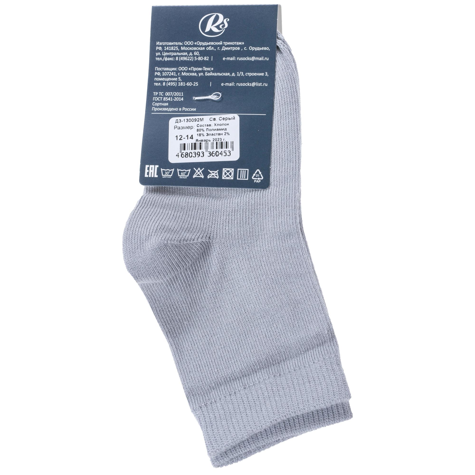 Круглогодичные укороченные детские носки, цвет светло-серый, классические, шов кеттельный (бесшовная технология), принт (рисунок): однотонный, без рисунков/узоров, состав: 80% хлопок, 18% полиамид, 2% эластан, арт. Д3-130092М. Производитель «ООО Орудьевский трикотаж, Россия» под брендом «Rusocks (орудьевский трикотаж)».